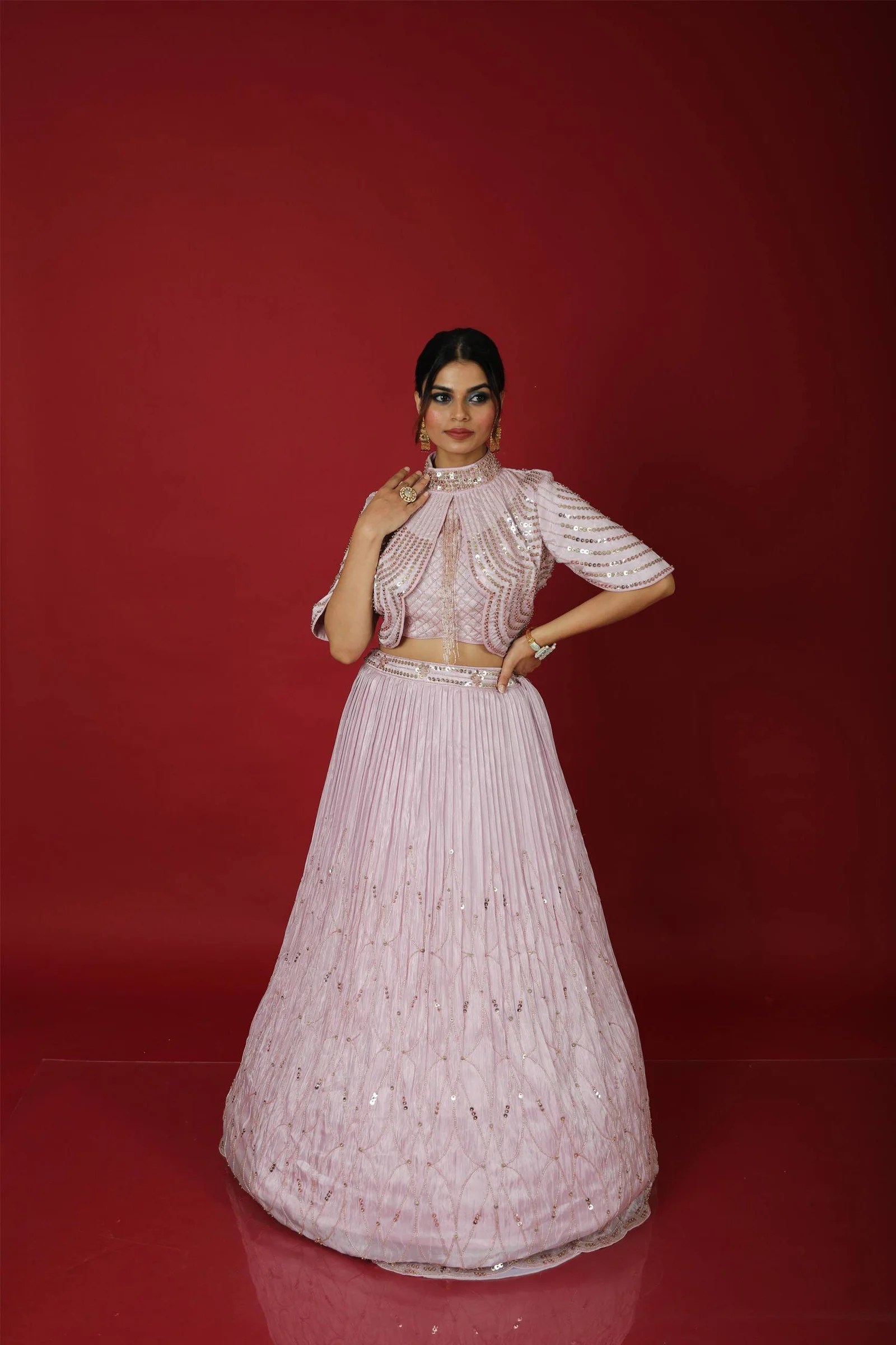 Graceful and ethereal, this pink lehenga in luxurious pearl tissue fabric exudes soft elegance. Handcrafted with metallic sequins work, it offers just the right hint of shimmer, perfect for modern celebrations with a traditional touch.