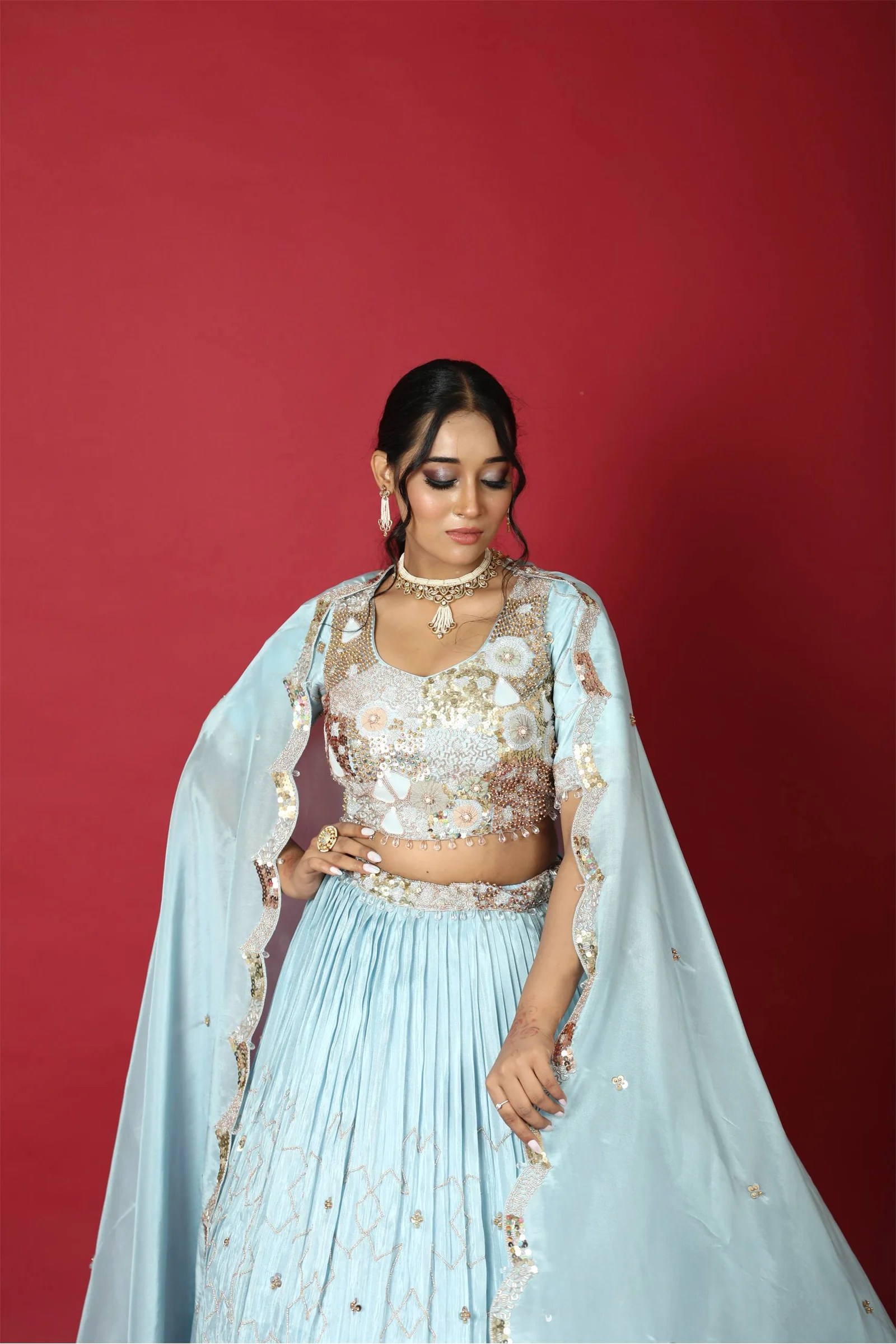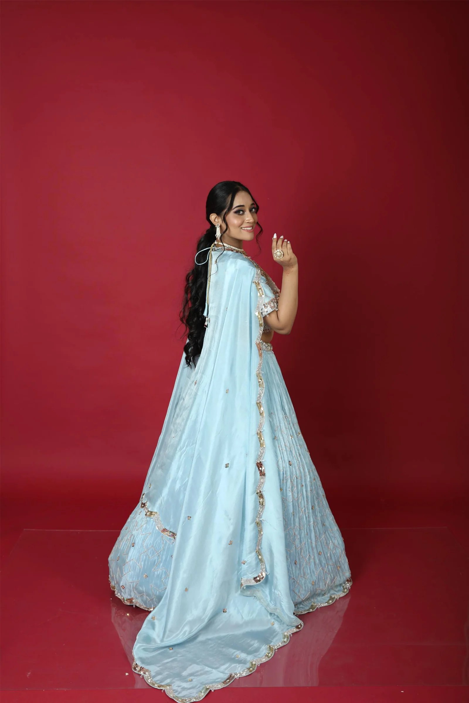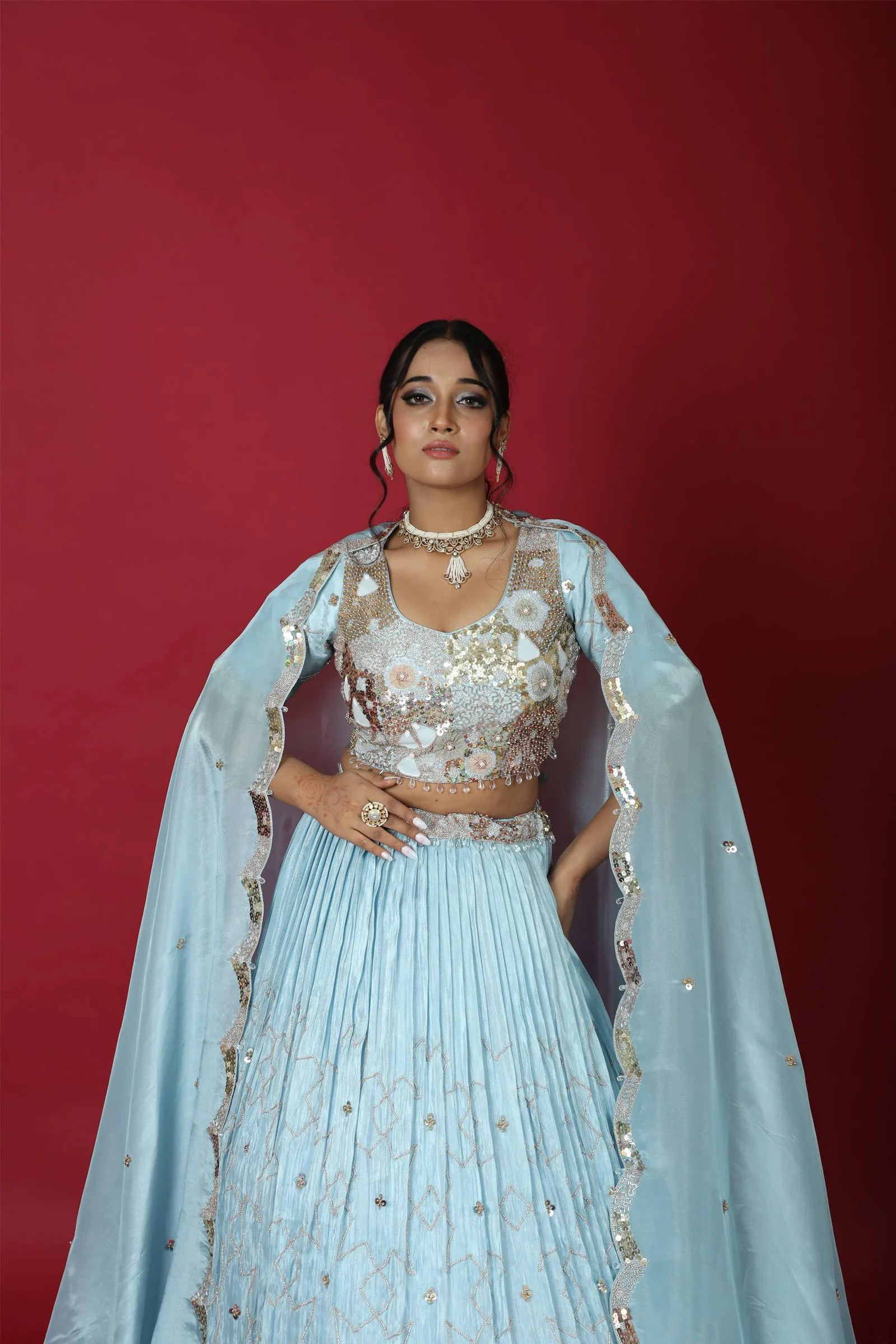 Step into elegance with this powder blue lehenga choli set, beautifully detailed with metallic sequin work. The flowing lehenga and matching blouse shimmer with intricate embellishments, while the lightweight dupatta adds a graceful touch with subtle sequin accents. Perfect for weddings and festive occasions, this ensemble blends soft charm with a hint of sparkle.
