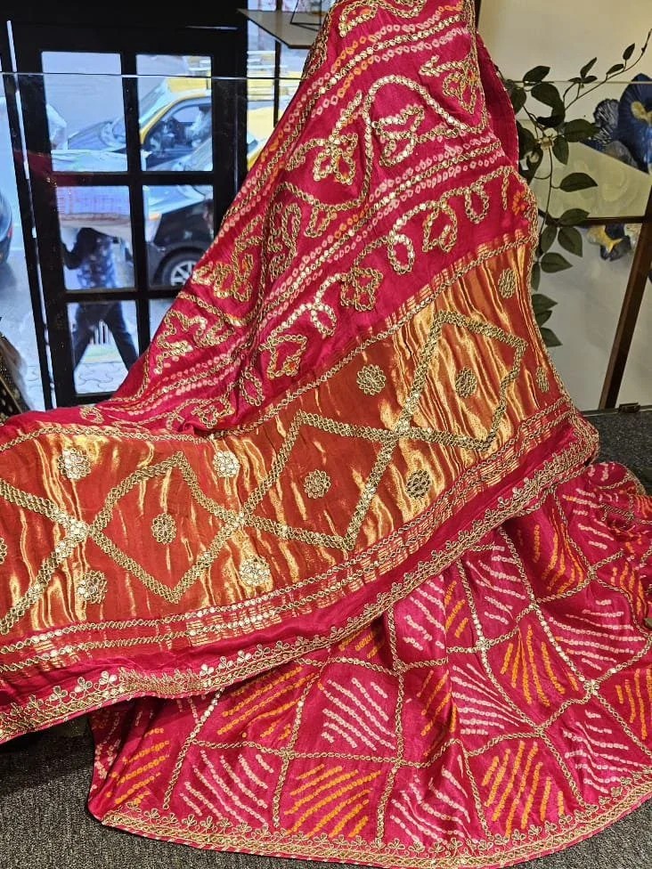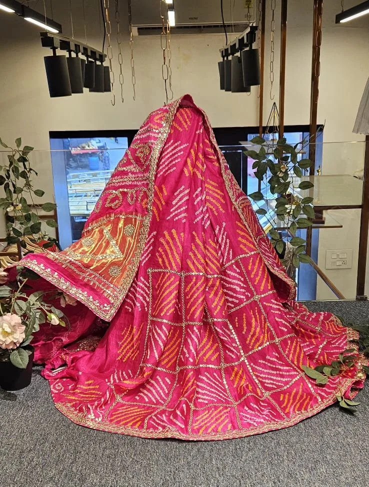 Elegance meets tradition in this stunning pure Gajji silk Bandhej saree, handcrafted with intricate Rai Bandhani designs and adorned with luxurious gotta work. The rich texture of Gajji silk, paired with vibrant Bandhej patterns, makes it a perfect choice for weddings and traditional occasions. A timeless piece that blends heritage with sophistication.
