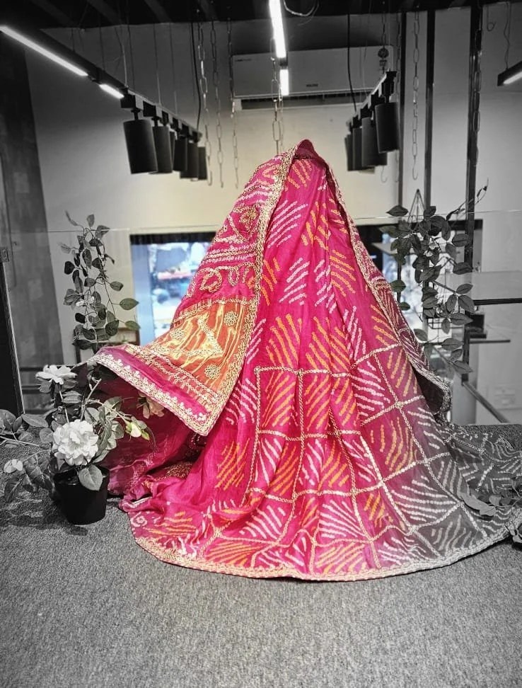 Every detail, from the vibrant Bandhej patterns to the gleaming gota embellishments, tells a story of craftsmanship, heritage, and luxury. Pair it with handloom jewellery for a royal look that never goes out of style.