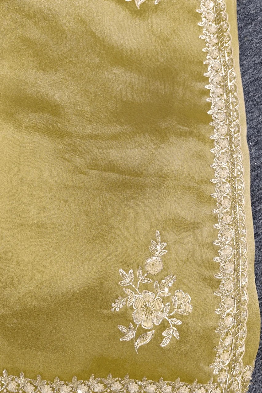 A delicate tissue organza saree featuring a delicate zari border, adorned with intricate booties all over, beautifully embellished with zardoshi,sequence and pearl work for a touch of timeless elegance and regal charm.
