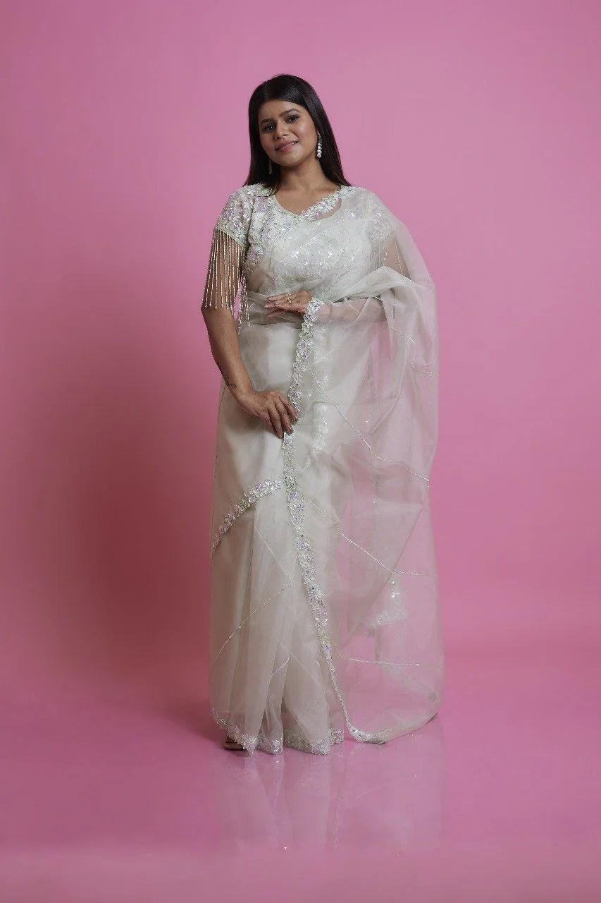 A divine white organza saree featuring delicate white and self-sequins work that adds a subtle, ethereal shimmer. Finished with soft tassels for an elegant touch, this saree embodies grace and purity—perfect for weddings, engagements, or serene celebrations.