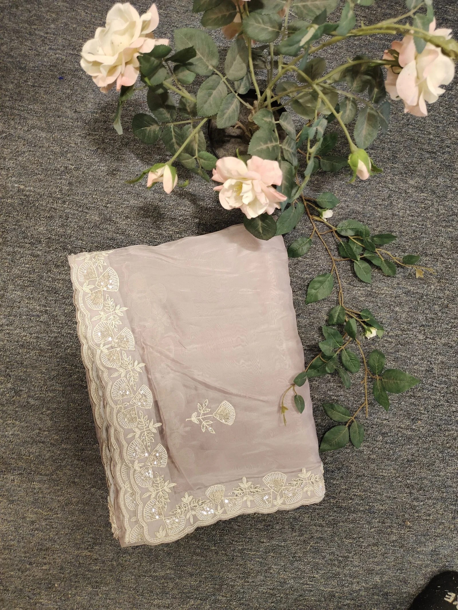 “Elegantly crafted in sheer silk organza, this saree features exquisite Zardoshi, sequins, and Cutdana work. The sophisticated English grey hue adds a touch of modern grace to its traditional craftsmanship.”