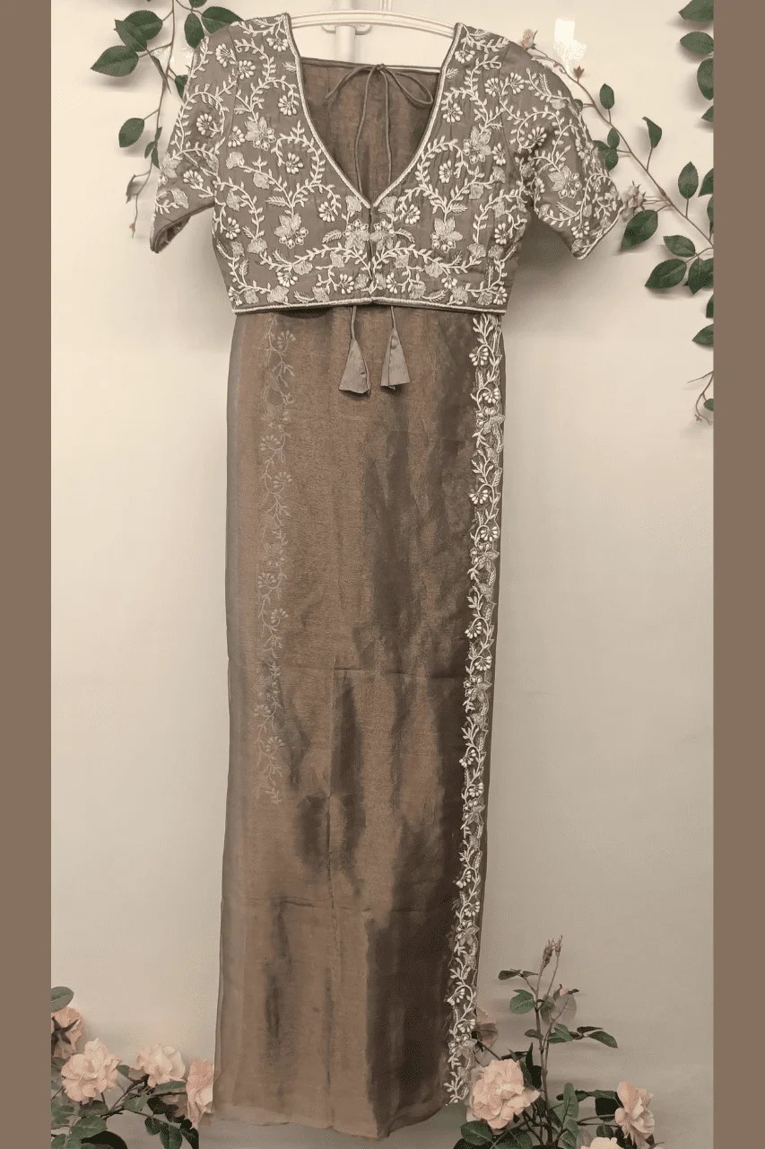 Elegantly crafted in sheer tissue, this saree features exquisite cutdana and pearl work. The sophisticated metallic bronze hue adds a touch of modern grace to its traditional craftsmanship.”