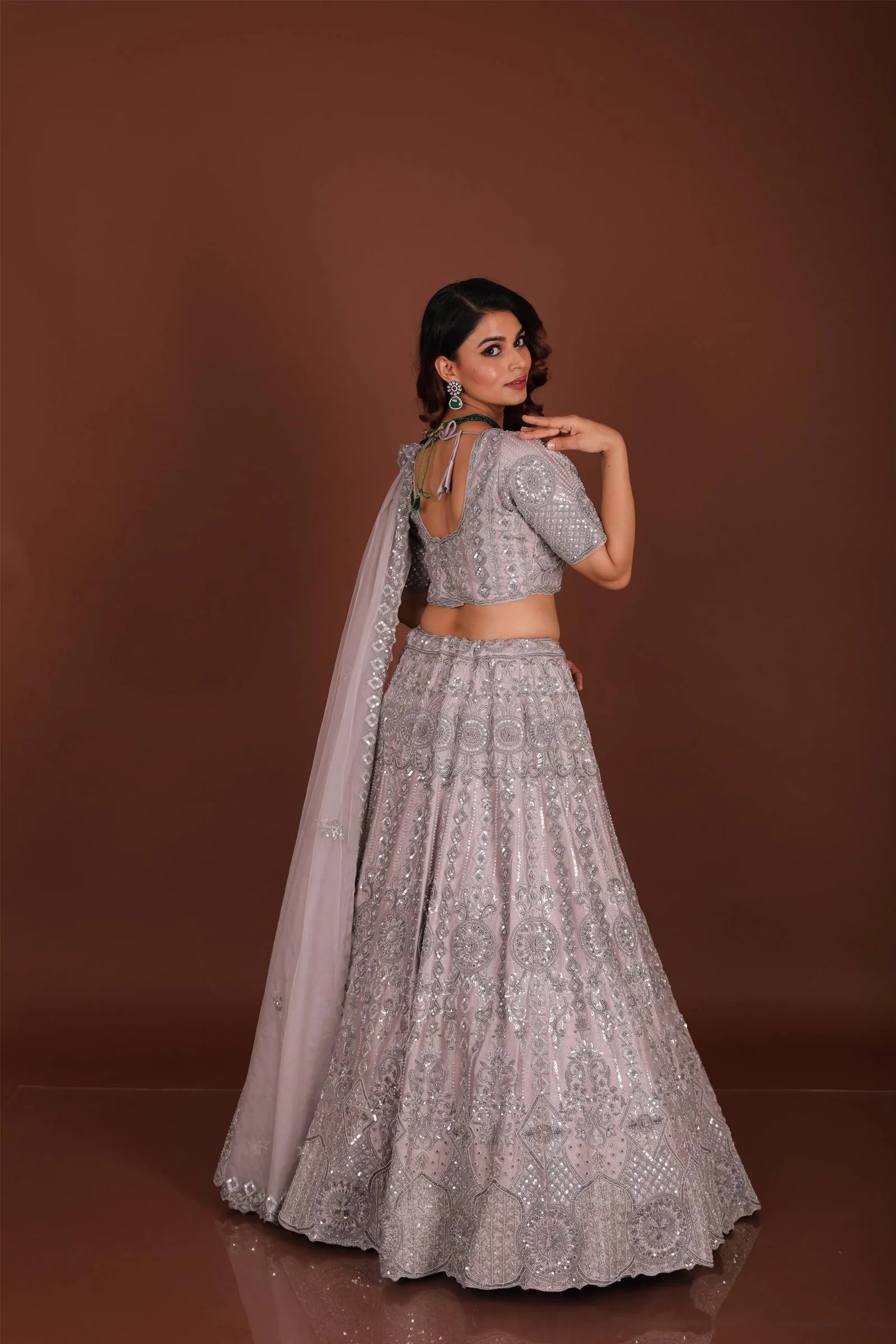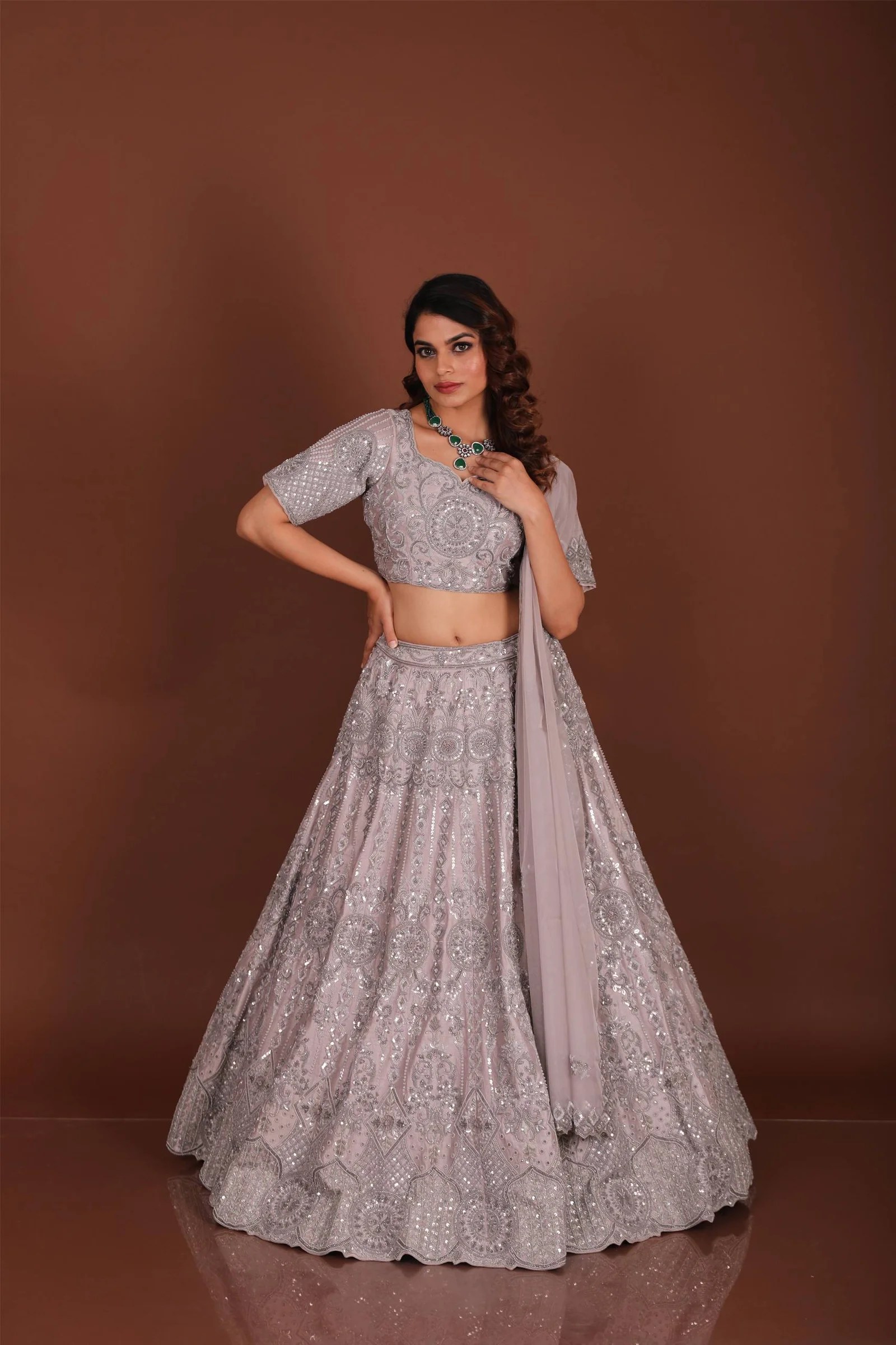 Grace meets grandeur in this stunning grey chaniya choli, beautifully crafted on luxurious silk fabric. The ensemble showcases intricate handcrafted cutdana and sequins work, lending a refined sparkle and timeless elegance to the traditional silhouette. The soft, flowing chaniya (skirt) pairs harmoniously with a richly embellished choli (blouse), creating a regal look ideal for weddings, festive celebrations, or evening soirées.