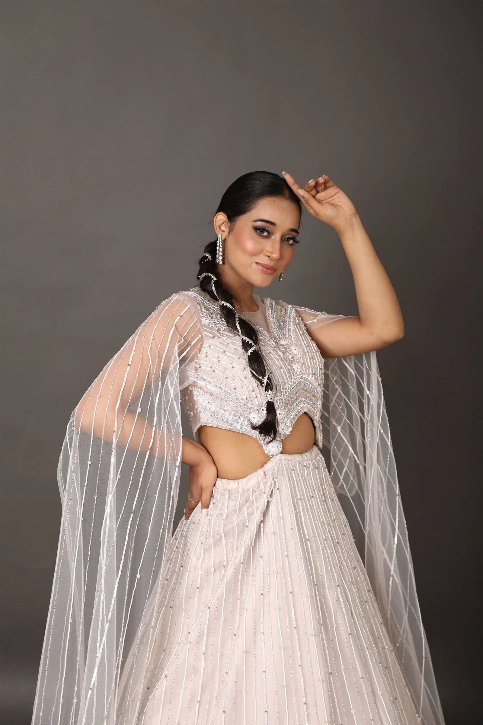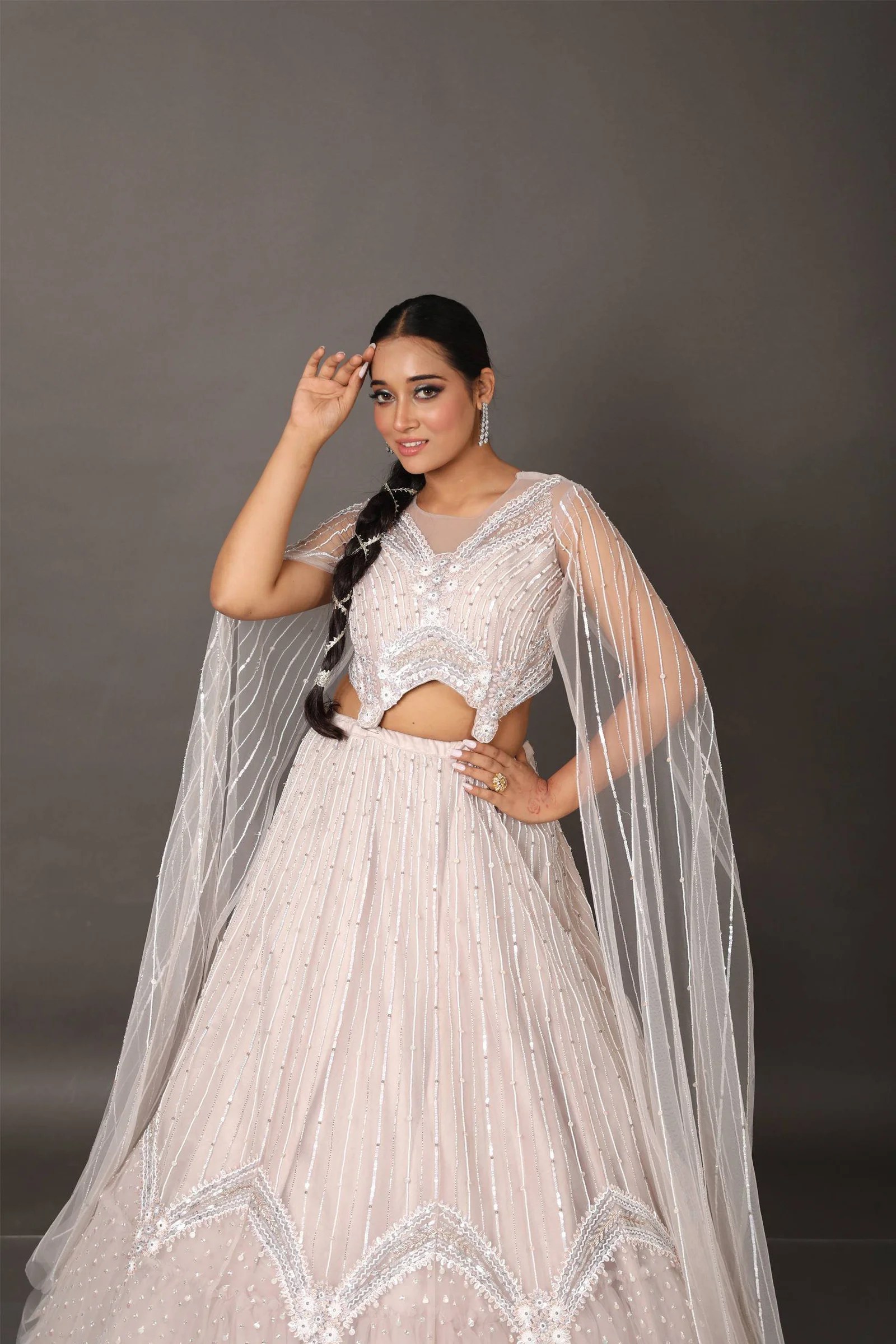 Turn heads in this ethereal net fabric lehenga, exquisitely handcrafted to exude timeless elegance. The ensemble features delicate sequin and cutdana embroidery, adding just the right amount of shimmer and sophistication. A standout element is the long tail sleeves, gracefully designed to elevate the silhouette with a regal flair. Whether it’s a wedding celebration or a festive soirée, this lehenga promises a look that’s both graceful and unforgettable.