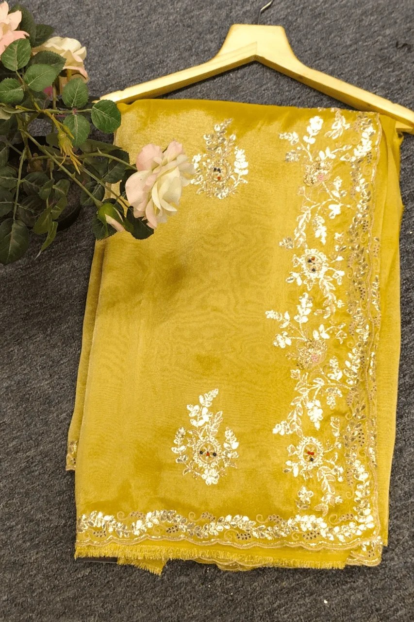 A stunning tissue organza saree in a regal bright yellow hue, adorned with rich gotta work, shimmering sequence, and delicate pitha work. Traditional craftsmanship meets timeless elegance—perfect for festive and wedding occasions.