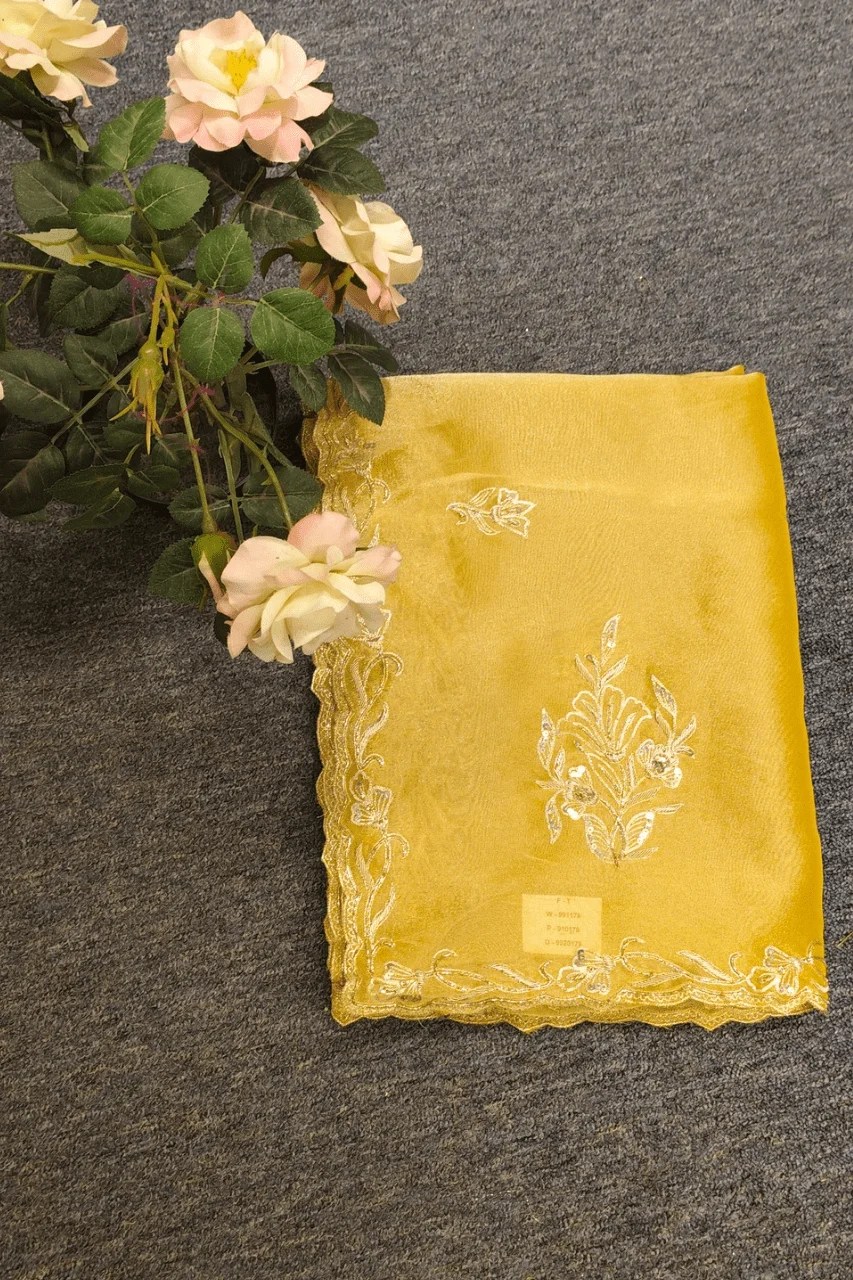 A delicate tissue organza saree featuring a delicate zari border, adorned with intricate booties all over, beautifully embellished with zardozi and nakshi work for a touch of timeless elegance and regal charm.