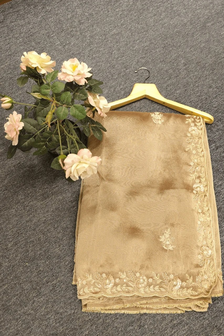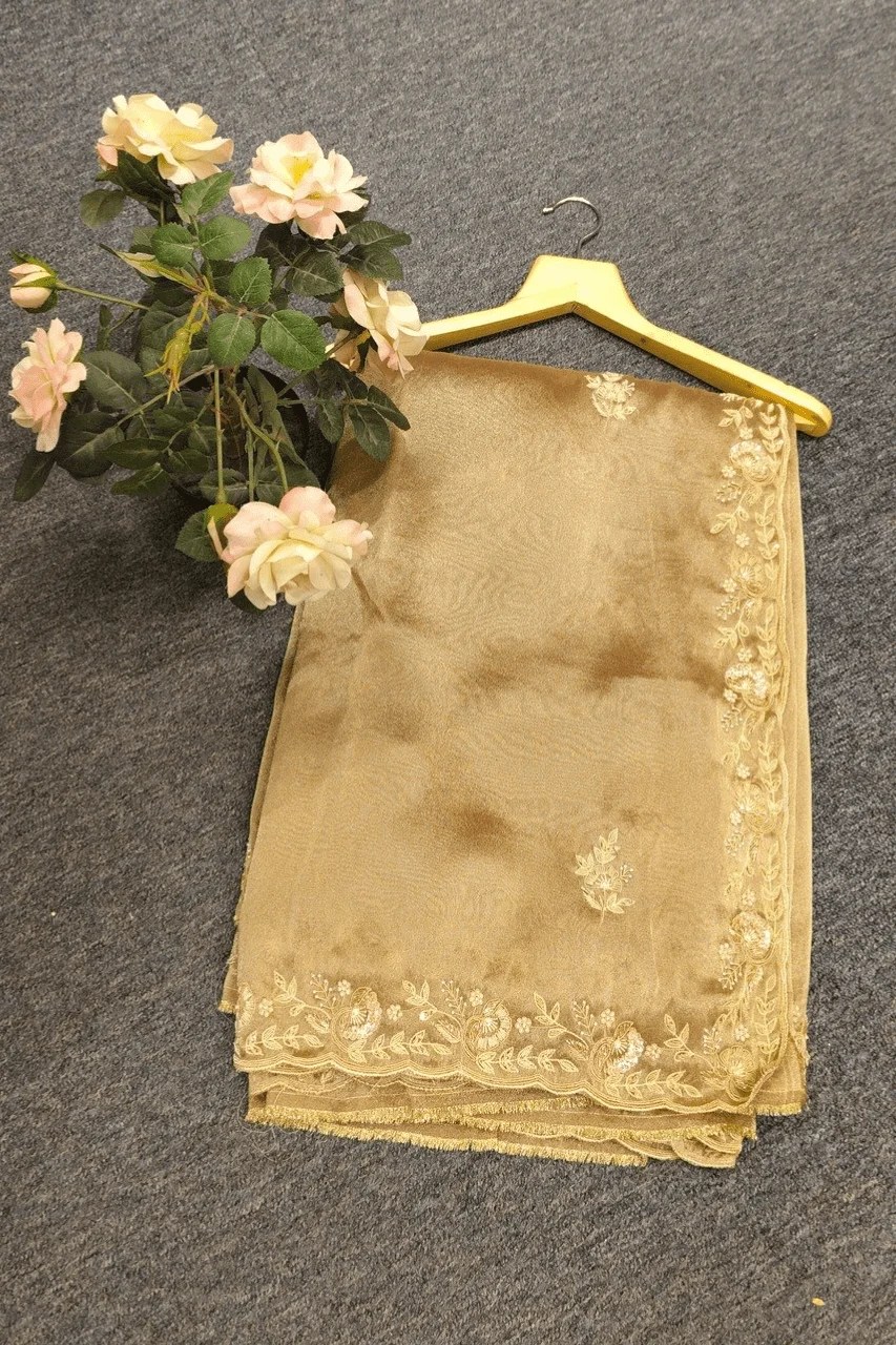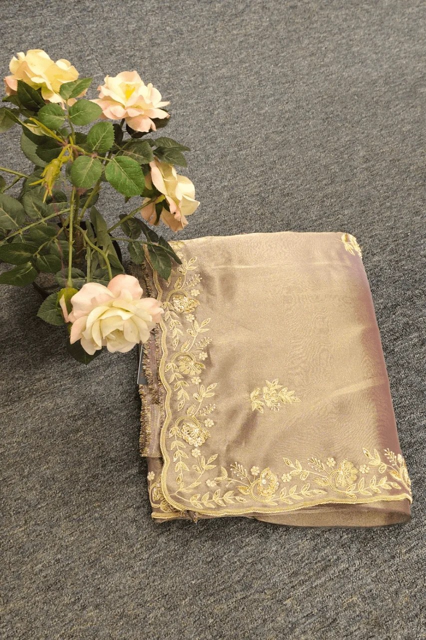 A delicate tissue organza saree featuring a delicate zari border, adorned with intricate booties all over, beautifully embellished with zardozi and nakshi work for a touch of timeless elegance and regal charm.