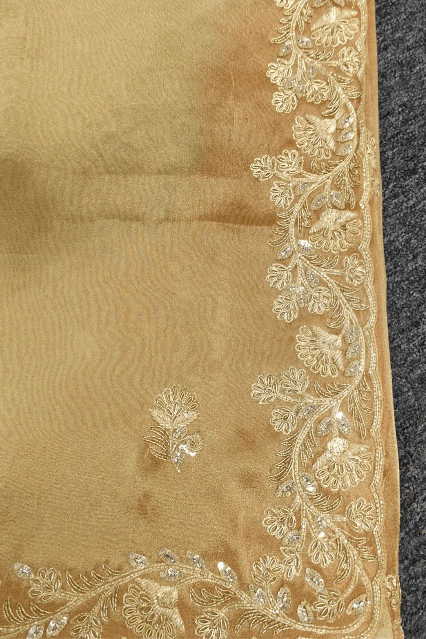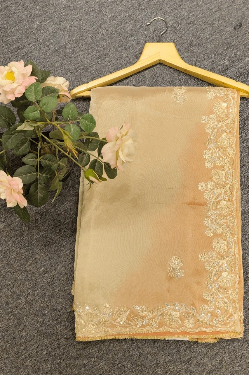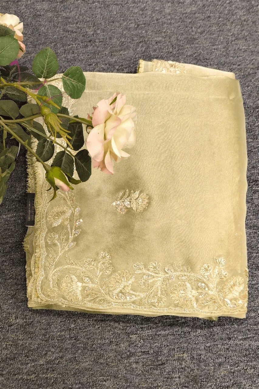 A delicate tissue organza saree featuring a delicate zari border, adorned with intricate booties all over, beautifully embellished with zardoshi, sequence and cutdana work for a touch of timeless elegance and regal charm.