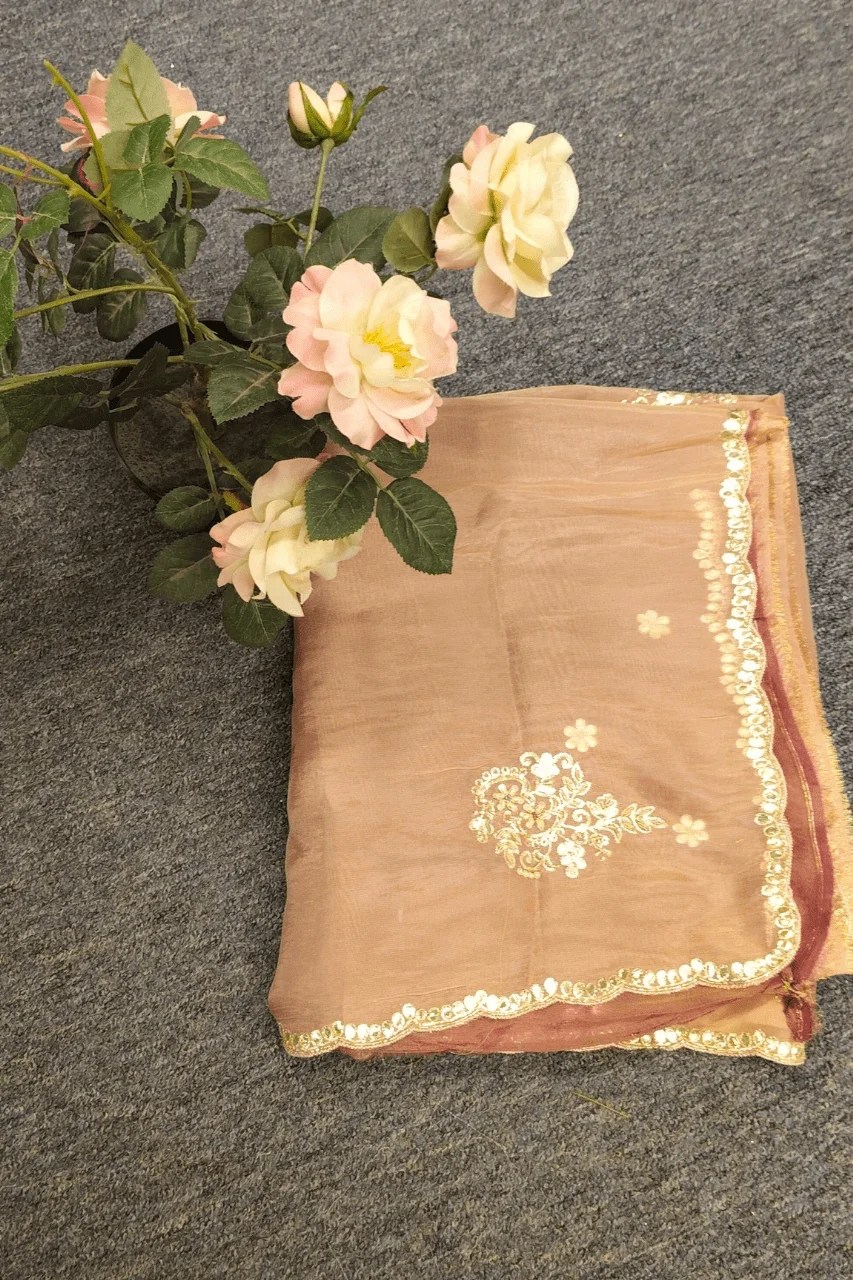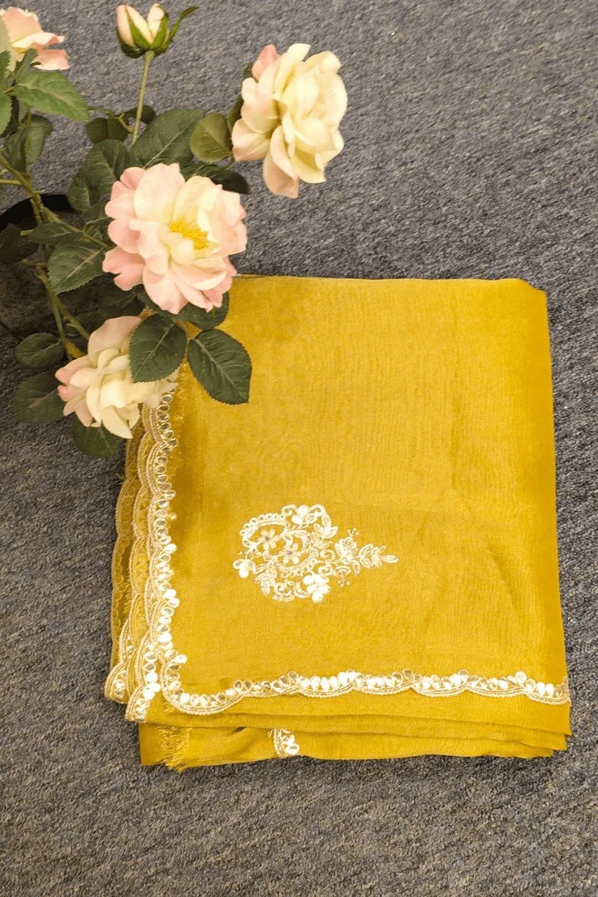 A delicate tissue organza saree featuring a light gotta border, adorned with intricate booties all over, beautifully embellished with zardozi and nakshi work for a touch of timeless elegance and regal charm.