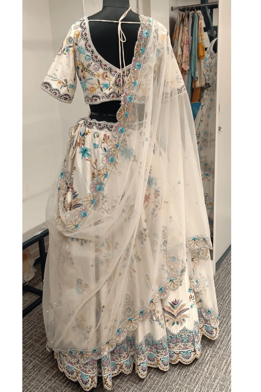 Make a grand statement on your special day with this stunning White Multicolored Lehenga, a masterpiece of traditional craftsmanship and regal elegance. Meticulously designed for weddings and unforgettable occasions, this lehenga features heavy silk thread embroidery with pearl and colourful sequence embellishments, showcasing intricate handwork that exudes timeless luxury and opulence.