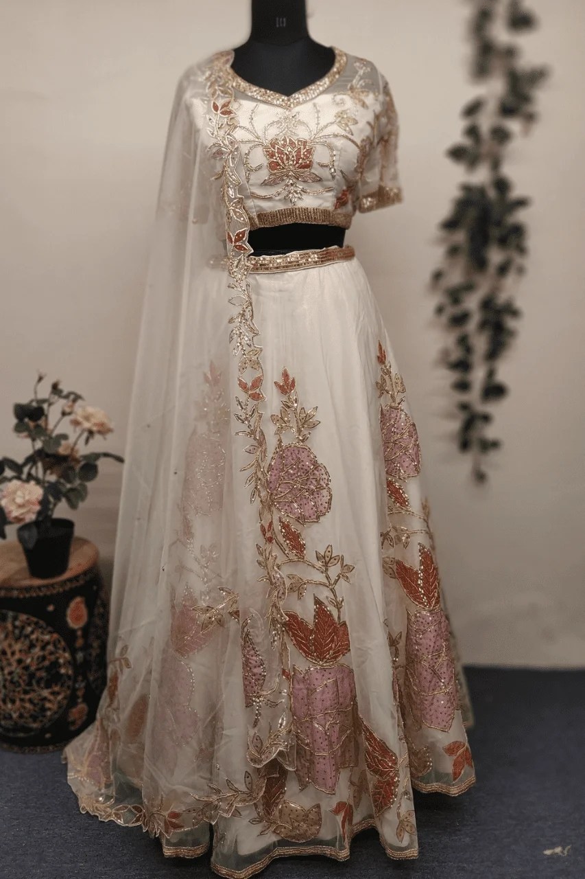 Embrace timeless grace with this pristine white lehenga, crafted from soft, flowing organza that exudes lightness and charm. Adorned with delicate floral appliqué motifs, each bloom is carefully outlined with traditional gotta work—bringing a beautiful blend of heritage and artistry to the modern silhouette.Sequins are thoughtfully placed to highlight the floral patterns, adding just the right touch of sparkle that shimmers subtly with every step. The contrast of intricate detailing against the clean white canvas creates a look that is both dreamy and regal.