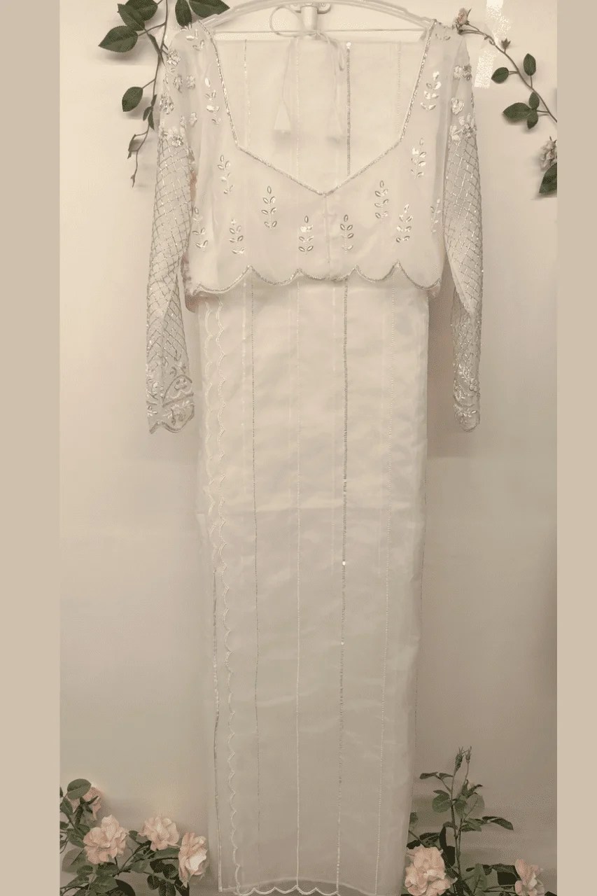 Elevate your elegance with this stunning White organza saree, adorned with intricate cutdana and pearl embellishments. Lightweight and graceful, it’s the perfect choice for parties and wedding occasions, adding a touch of sparkle and sophistication to your look.
