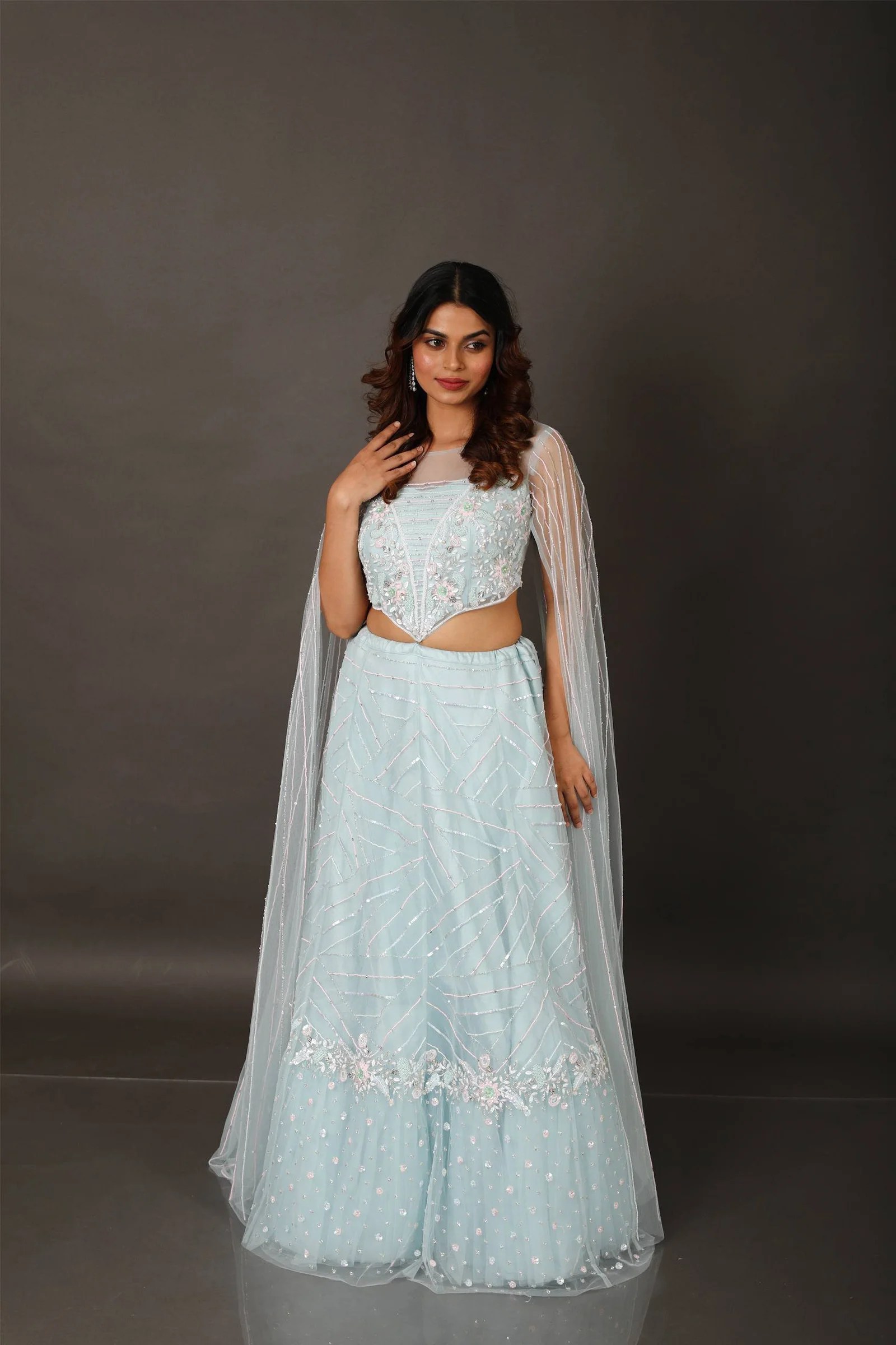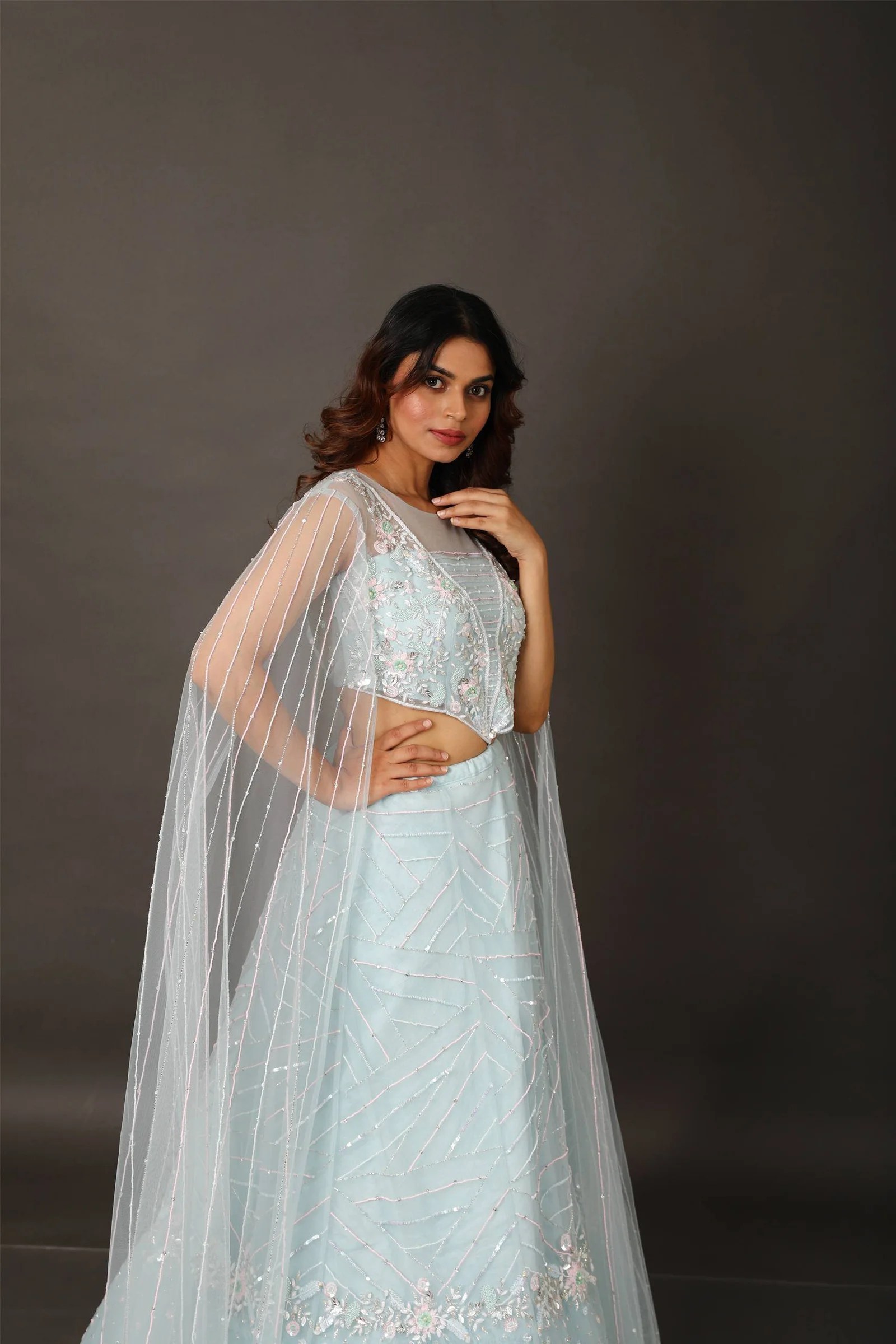 Turn heads in this ethereal net fabric lehenga, exquisitely handcrafted to exude timeless elegance. The ensemble features delicate sequin and cutdana embroidery, adding just the right amount of shimmer and sophistication. A standout element is the long cape sleeves, gracefully designed to elevate the silhouette with a regal flair. Whether it’s a wedding celebration or a festive soirée, this lehenga promises a look that’s both graceful and unforgettable.