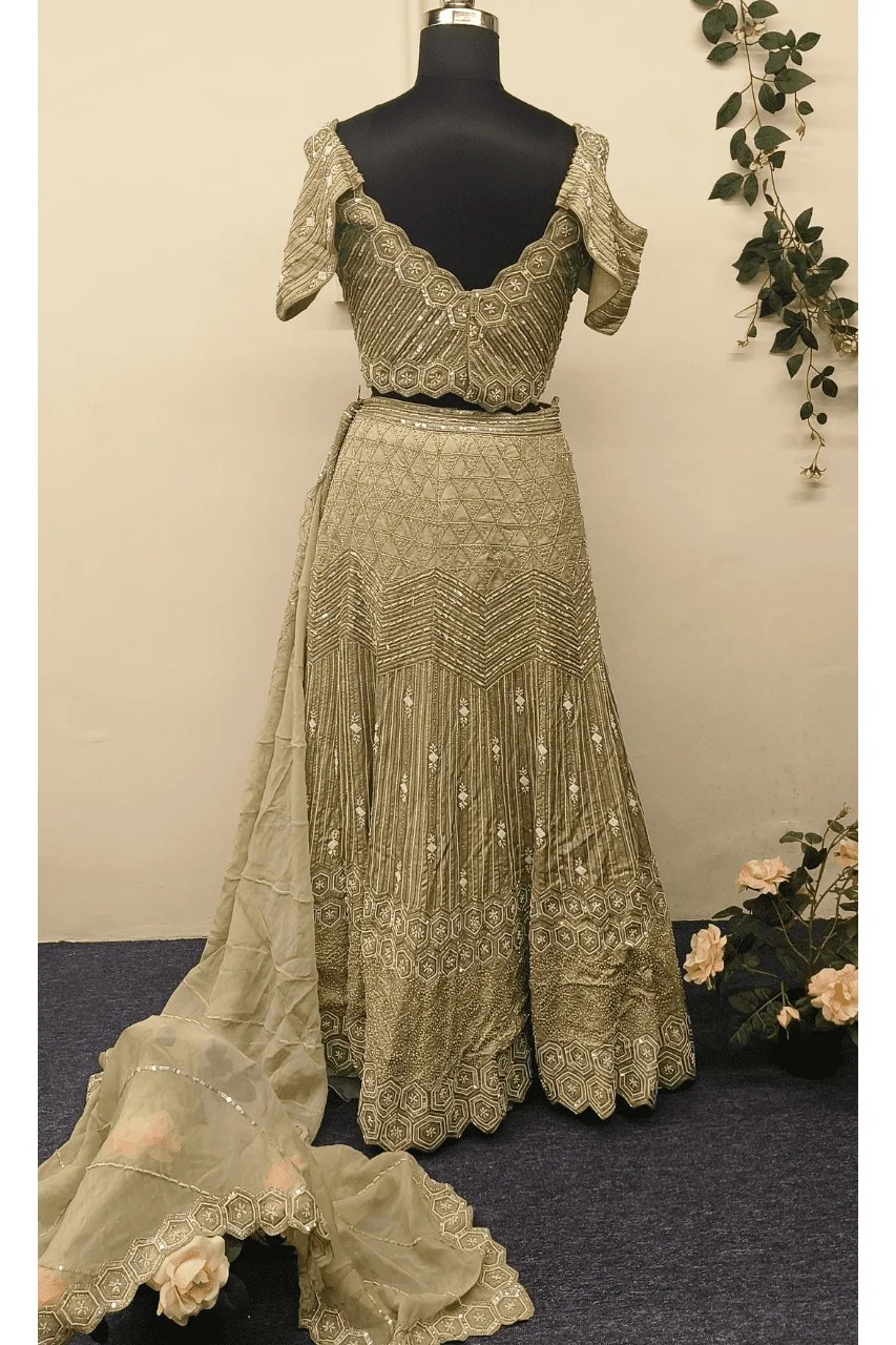 Elevate your mehendi look with this exquisite olive green lehenga, crafted from luxurious silk and paired with a sheer, flowy organza dupatta. A true celebration of artistry, this ensemble is adorned with handcrafted geometric patterns brought to life through intricate sequin, pearl, and thread work.