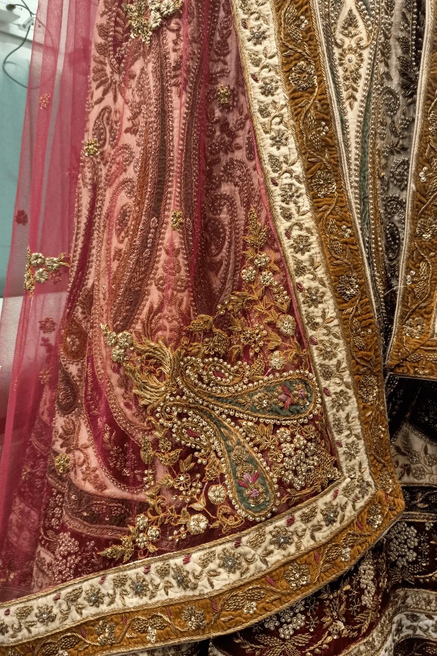 This exquisite traditional white silk lehenga is a true statement of timeless elegance. Richly adorned with intricate antique zardosi work on luxurious velvet appliqué, it reflects masterful craftsmanship and regal charm. The ensemble is completed with heavy border and a contrast net dupatta, delicately embellished to enhance its grandeur. Perfect for weddings and grand celebrations, this lehenga exudes grace, tradition, and sophistication in every detail.