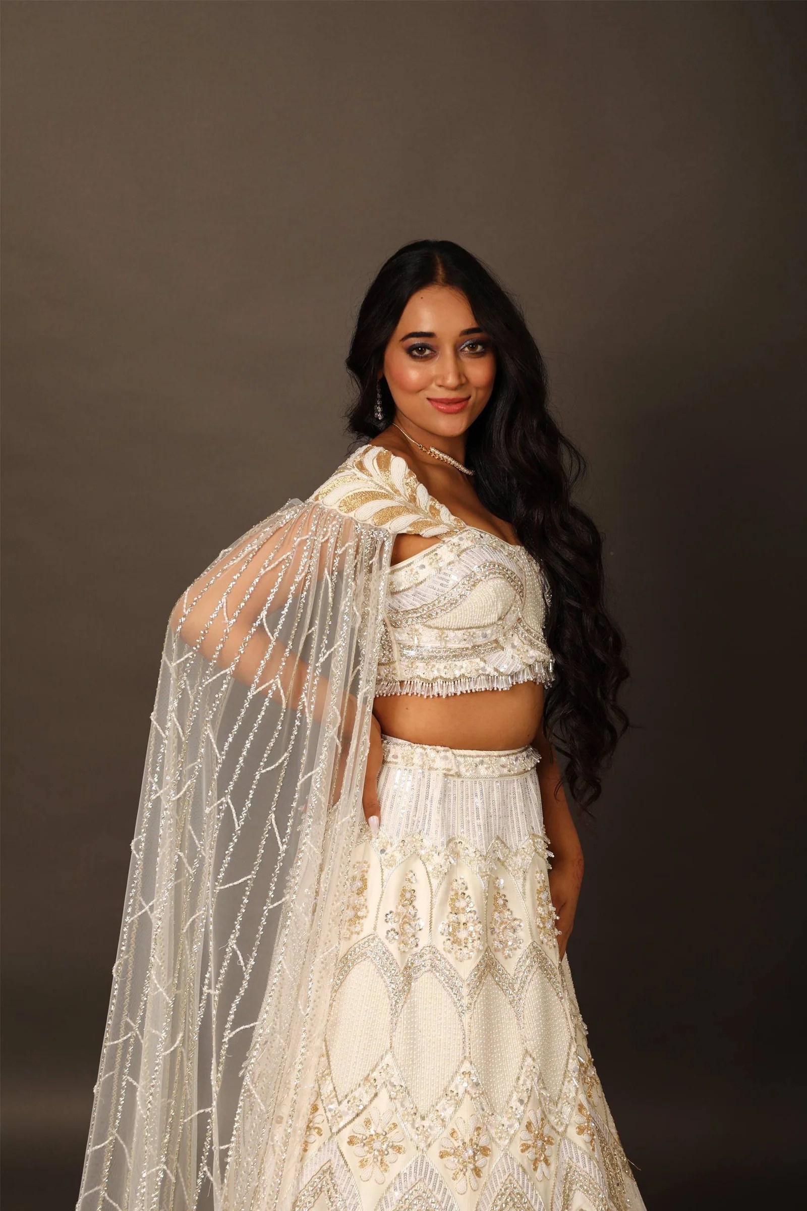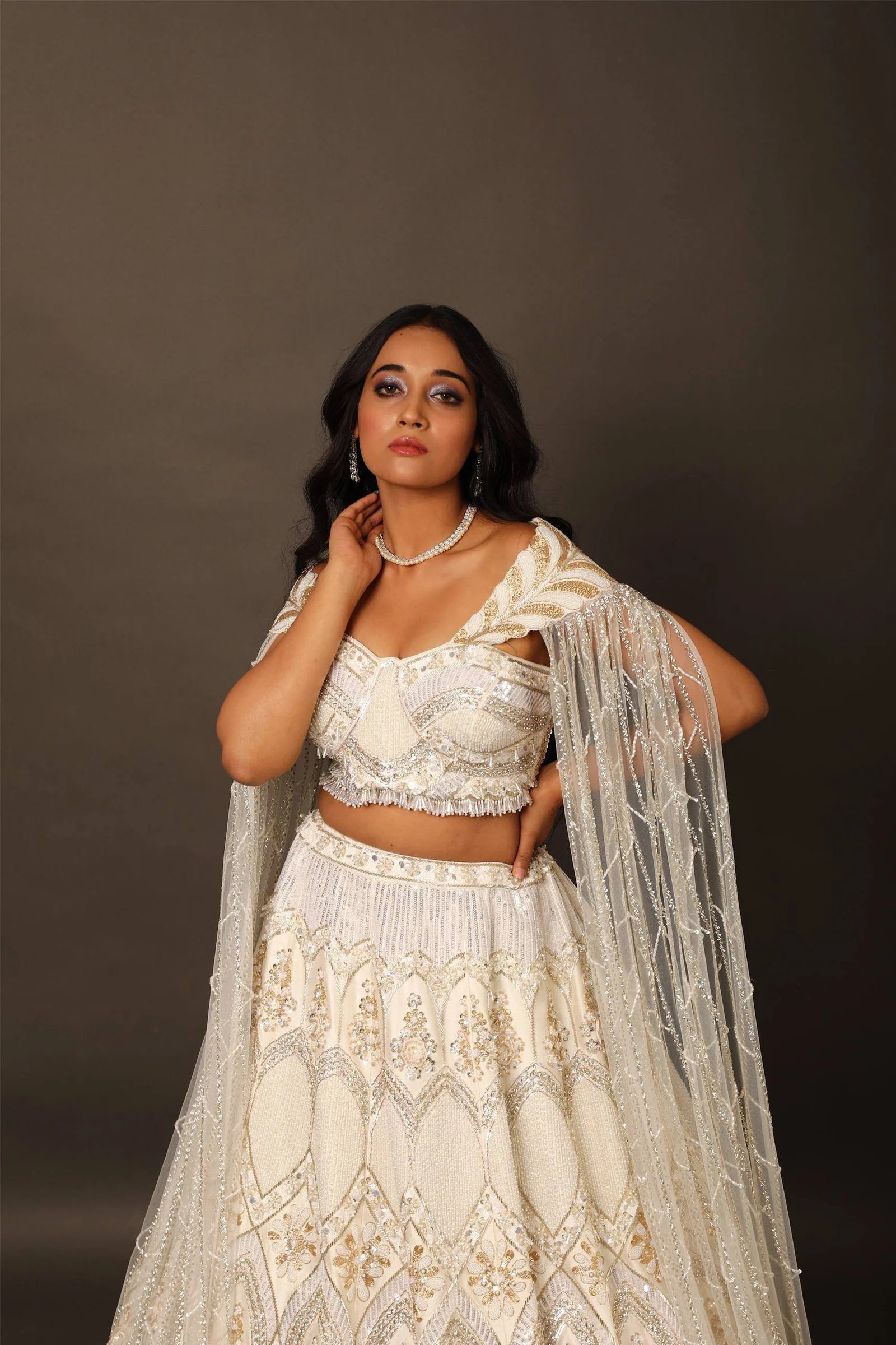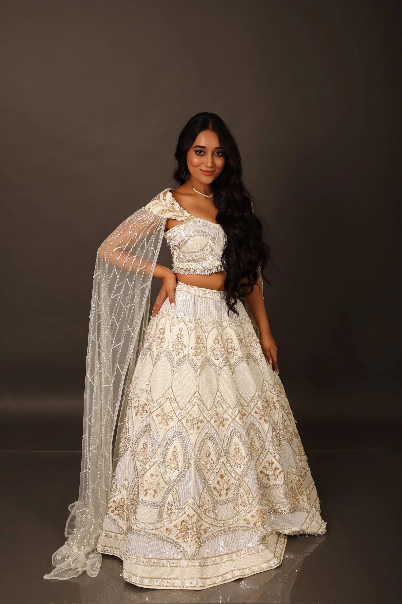 Step into timeless elegance with this exquisite White ghaghra choli, handcrafted to perfection. The ensemble features a gracefully flared lehenga paired with a off-shoulder stunning choli adorned with long tail sleeves, adding a touch of modern drama to a traditional silhouette.