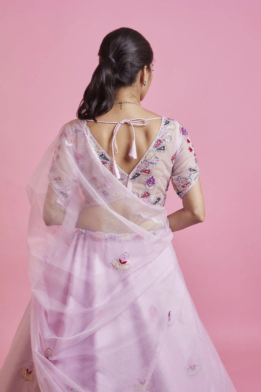 Grace meets artistry in this exquisite baby pink lehenga of sheer organza, adorned with vibrant applique floral motifs that bring a burst of color and character to the timeless base. Intricately highlighted with delicate pearl and sequence embellishments, this piece beautifully blends modern creativity with classic craftsmanship.