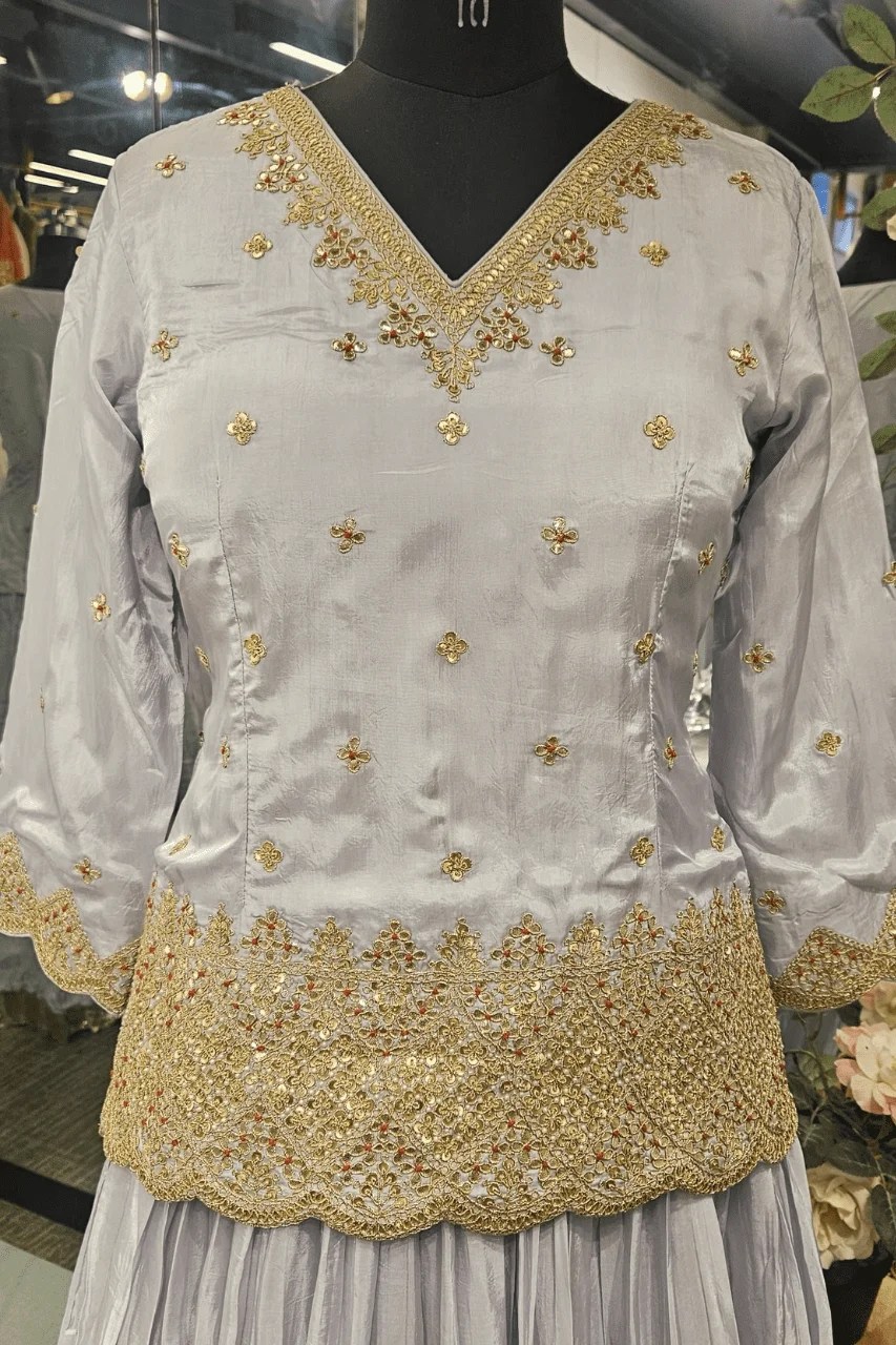 Perfect for festive gatherings or wedding rituals, this elegant silk outfit features a short kurti, flared lehenga, and organza dupatta — all beautifully handcrafted with gotta, marodi and frenchknot work, adding a timeless royal charm to your celebration style.