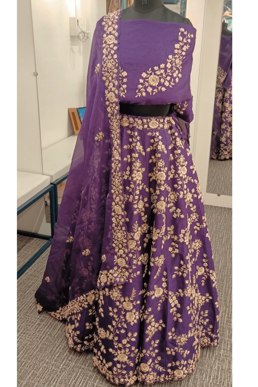 This exquisite vintage purple silk ghaghra is a true masterpiece, meticulously handcrafted with intricate full loaded zardoshi embroidery. The rich hue of the silk radiates royalty, while the detailed craftsmanship reflects traditional artistry. A modern silhouette and refined finishing touches add contemporary elegance, making it a perfect ensemble for weddings, festive occasions, or grand celebrations.