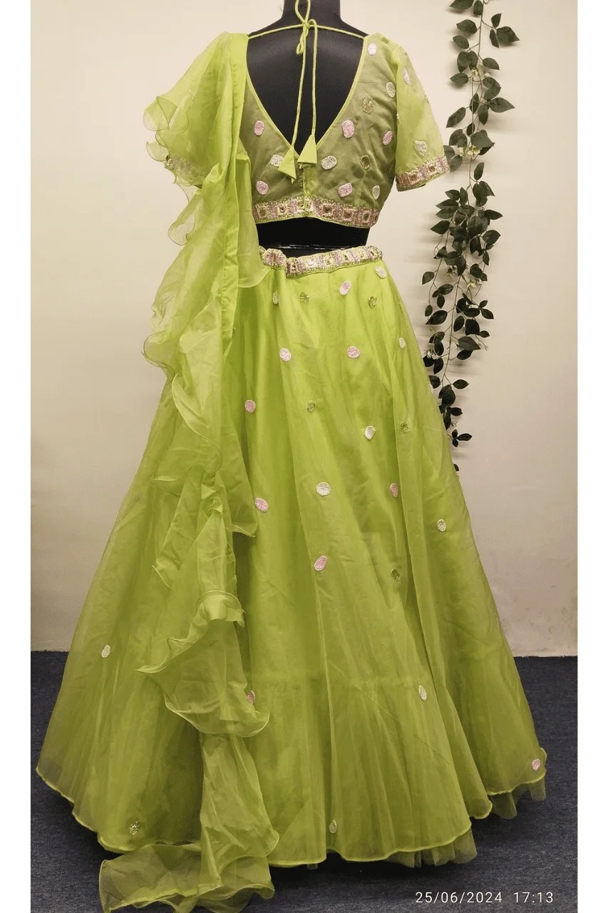 Turn heads and steal hearts with this refreshing green lehenga, crafted from airy organza that flows with grace and lightness. Handcrafted with intricate multicolored sequin, pearl, and delicate thread work, every detail reflects vibrant artistry—perfect for carnival functions and festive celebrations.