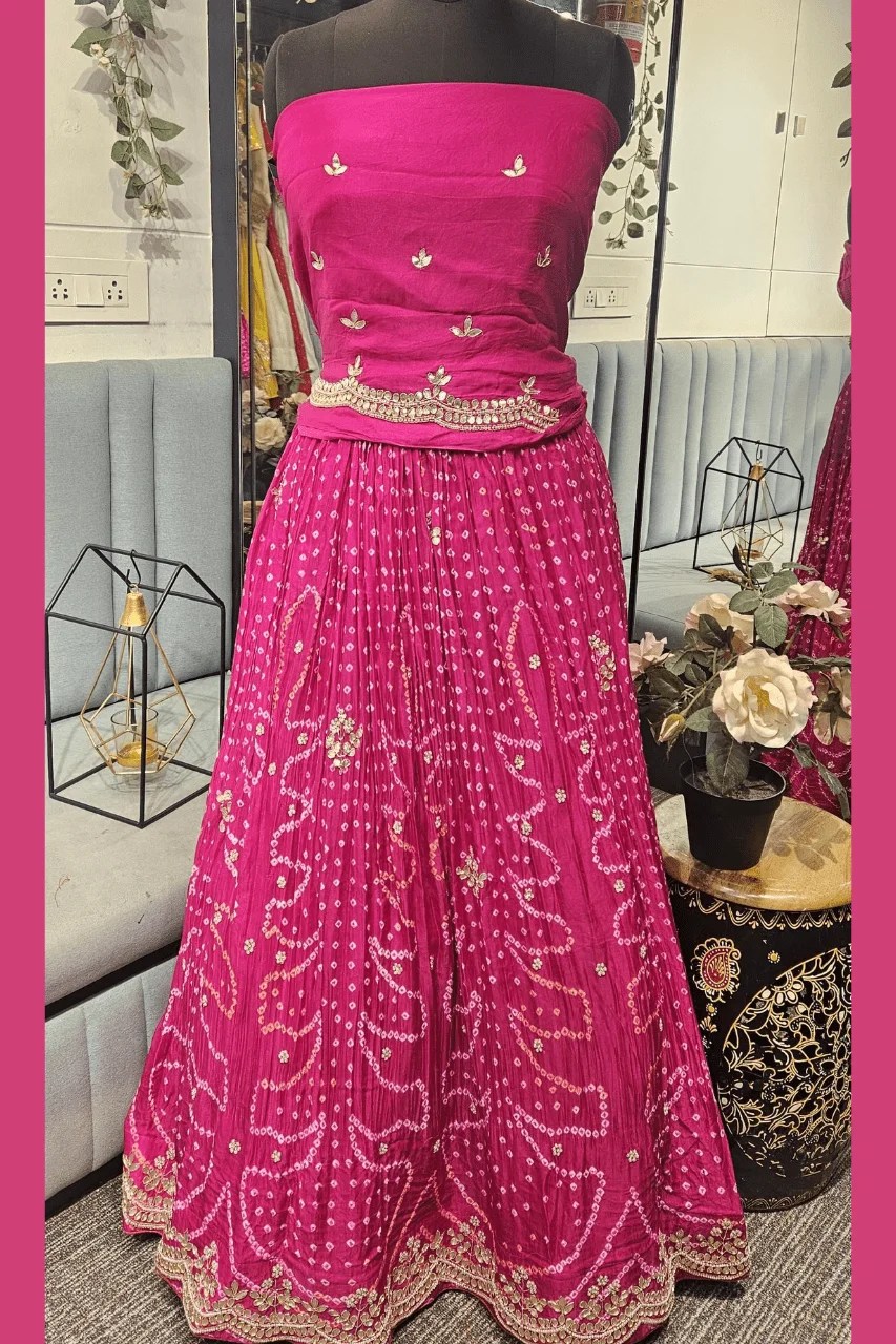 Perfect for weddings and festive celebrations, this elegant Bandhej lehenga in rich Gajji silk is adorned with traditional gotta and pearl handwork. Paired with an unstiched blouse and a beautifully scalloped dupatta border, it exudes timeless Rajasthani charm with a touch of modern grace.