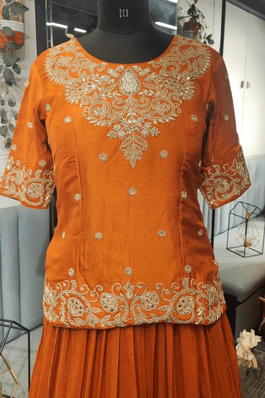 Perfect for festive gatherings or wedding rituals, this elegant silk outfit features a short kurti, flared lehenga, and dupatta — all beautifully handcrafted with marodi, sequins, and zardoshi work, adding a timeless royal charm to your celebration style.