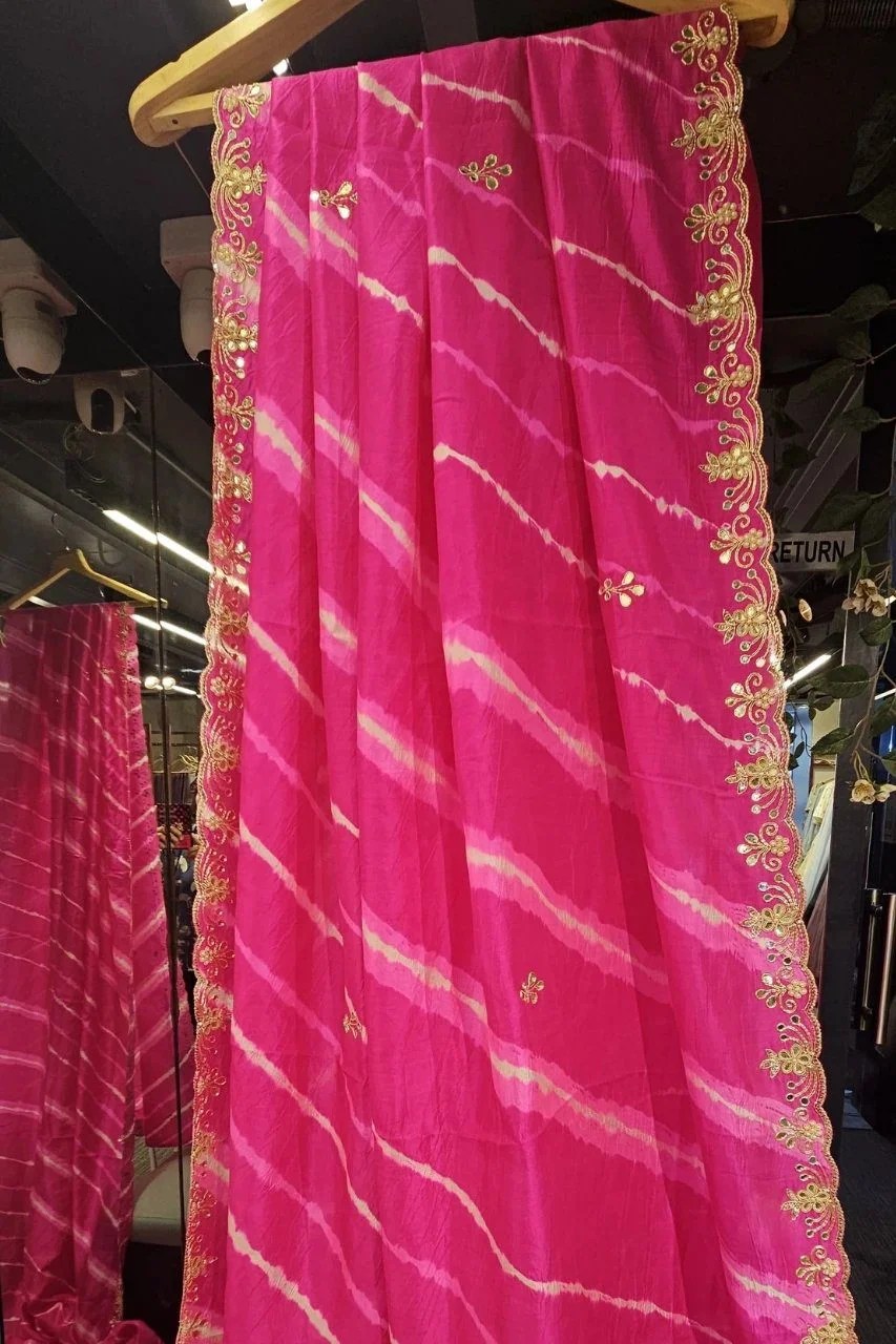 Elevate your festive look with this stunning lehriya saree in pure silk, adorned with intricate gotta and mirror handwork. The delicate detailing and vibrant hue blend tradition with timeless elegance. Perfect for weddings, sangeet, or special celebrations.
