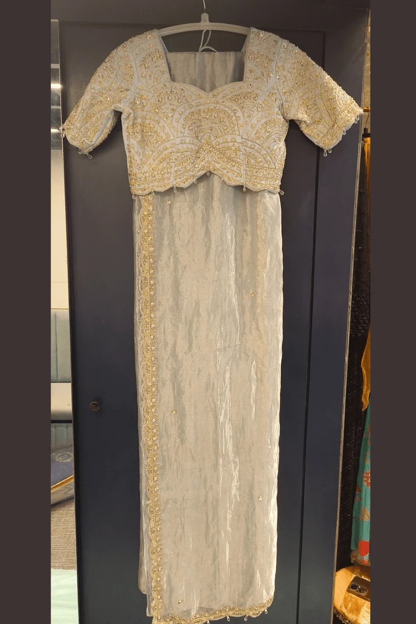 Elevate your elegance with this shimmering grey tissue saree, adorned with intricate cutdana and zardoshi embellishments. Lightweight and graceful, it’s the perfect choice for parties and wedding occasions, adding a touch of sparkle and sophistication to your look.