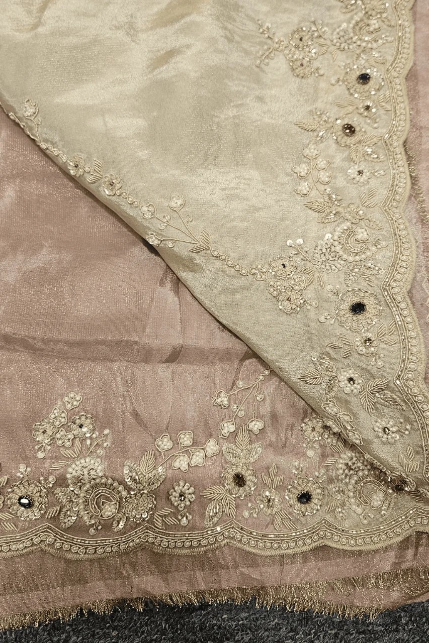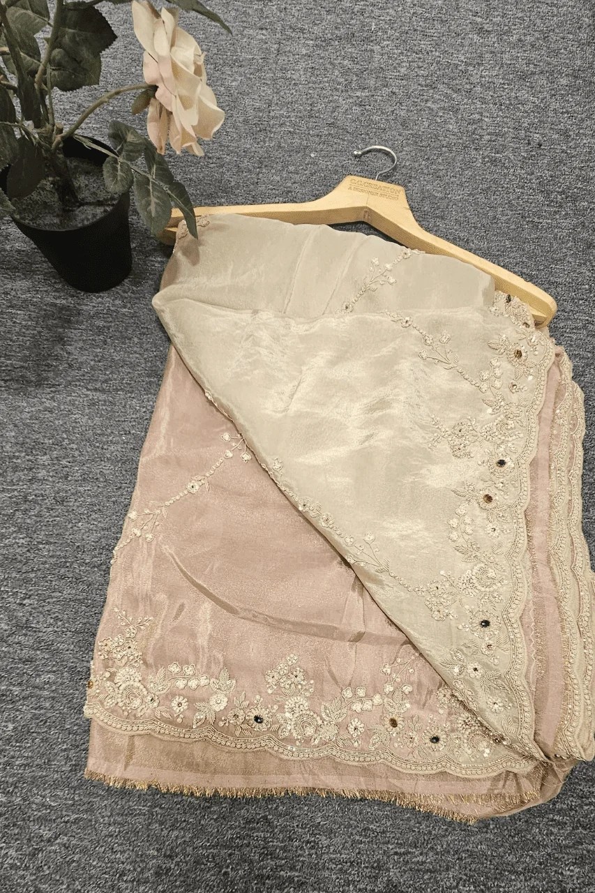 Elegantly handcrafted on silk organza, this ombre saree features exquisite sequence, cutdana,zardoshi, and delicate pearl work — a graceful blend of shimmer and sophistication.