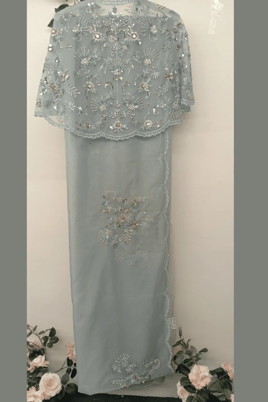 This Sky blue ensemble features a delicately embroidered blouse with pearl and sequin detailing, finished with cutwork border.Paired with a lightweight embroidered cape, it’s the perfect blend of grace and glamour for your special events.