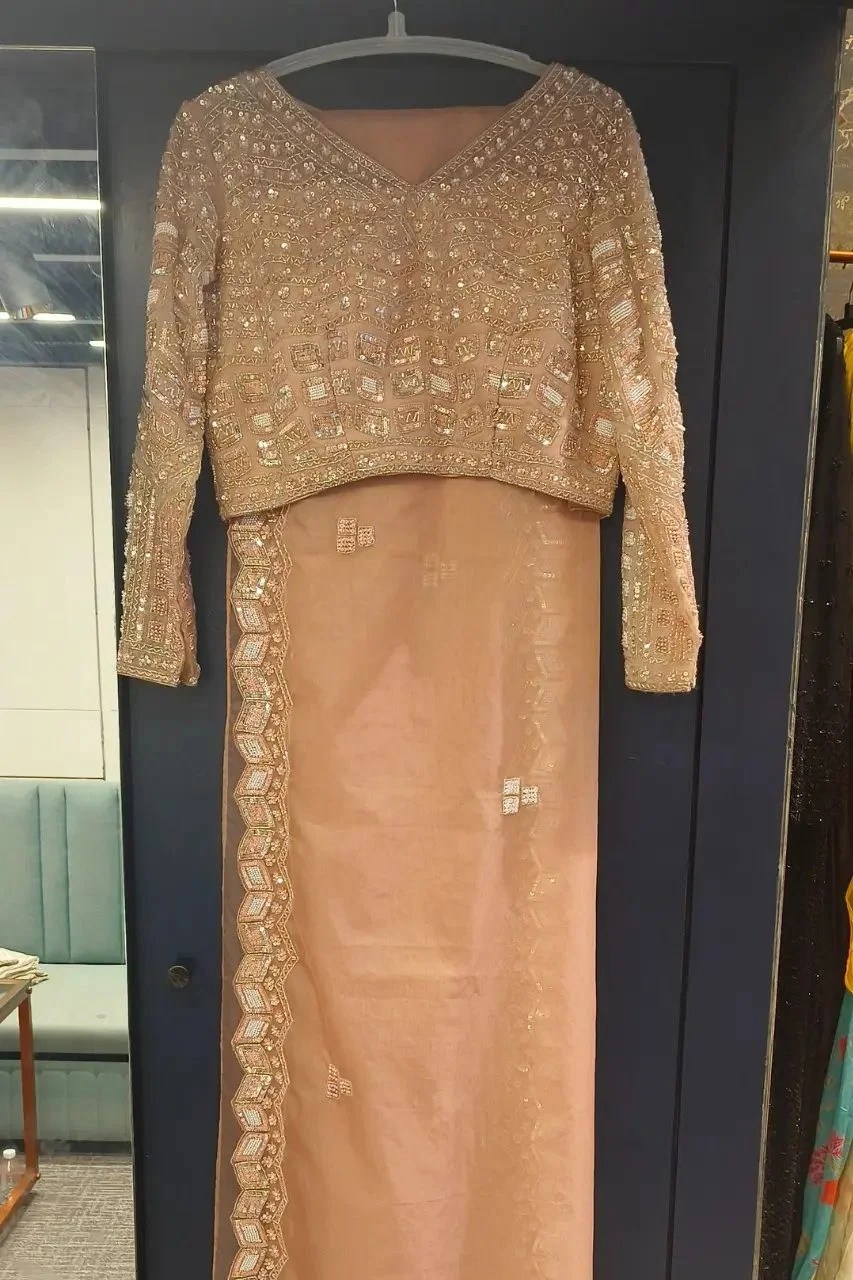 Elegant nude-tone organza saree adorned with intricate pearl, cutdana, sequence, and zardosi work. The richly embellished blouse and delicate border detailing add a timeless charm—perfect for graceful festive or wedding occasions.