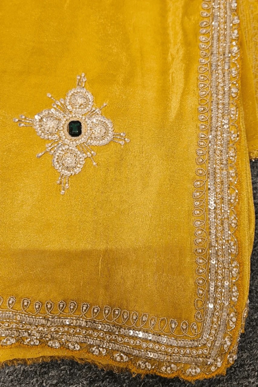 A stunning pearl tissue saree in a regal bright yellow hue, adorned with rich cutdana work, shimmering sequence, and delicate pearls. Traditional craftsmanship meets timeless elegance—perfect for festive and wedding occasions.