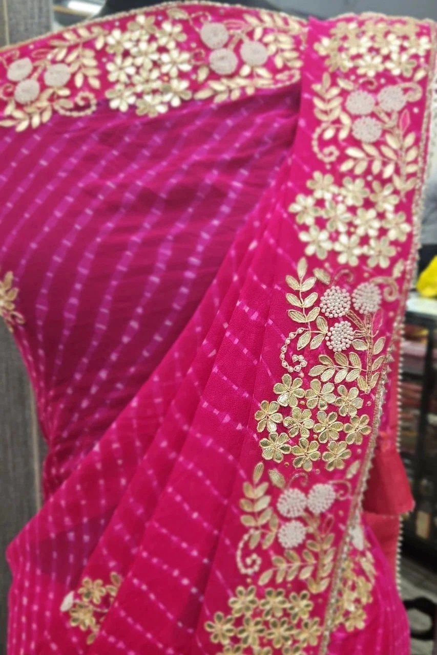 Elevate your festive look with this stunning mothda saree in pure georgette, adorned with intricate gotta and pearl handwork. The delicate detailing and vibrant hue blend tradition with timeless elegance. Perfect for weddings, sangeet, or special celebrations.