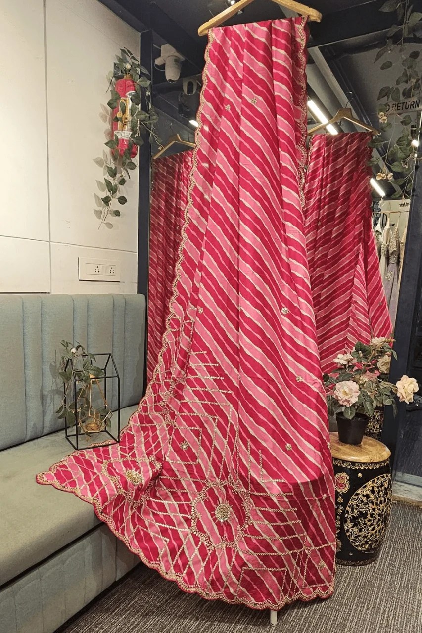Elevate your festive look with this stunning two tone lehriya saree in pure silk, adorned with intricate gotta,pearl and sequence handwork. The delicate detailing and vibrant hue blend tradition with timeless elegance. Perfect for weddings, sangeet, or special celebrations.