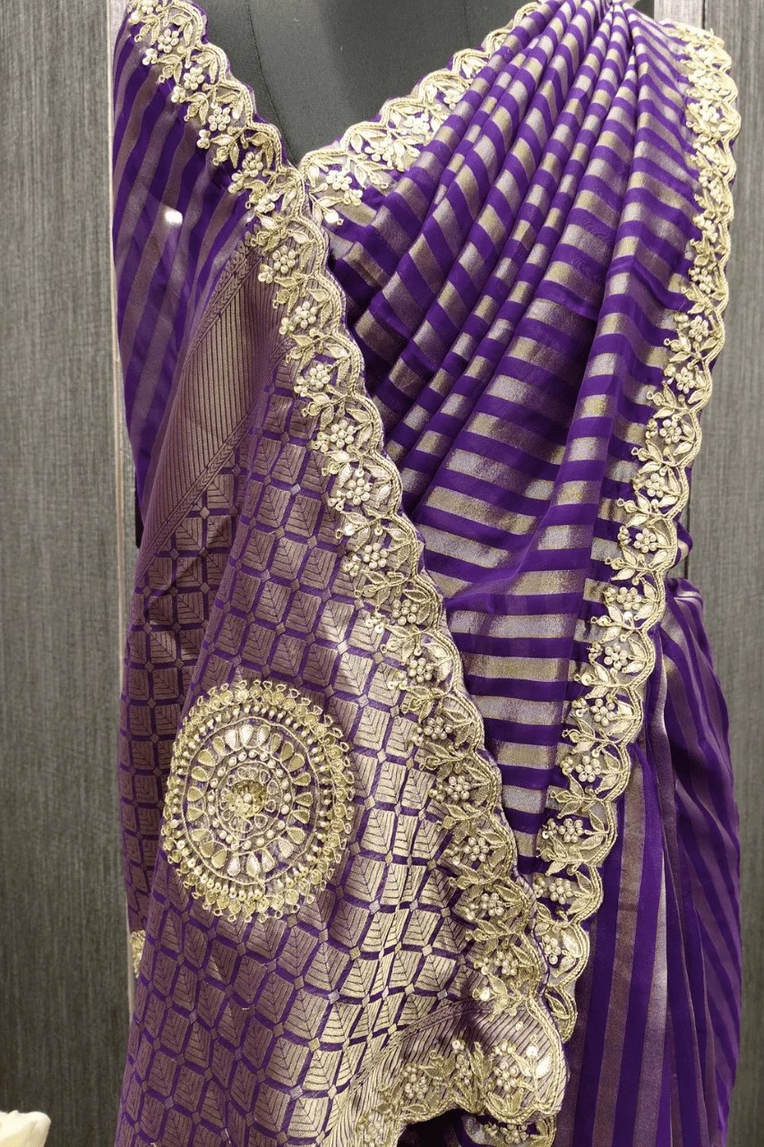 A majestic Banarasi saree in rich purple hues, gracefully embellished with intricate gotta, marodi, and pearl work. This regal drape exudes timeless elegance—perfect for weddings and grand festive occasions.