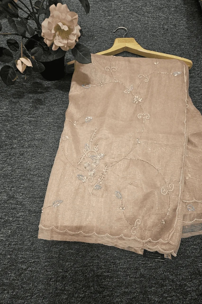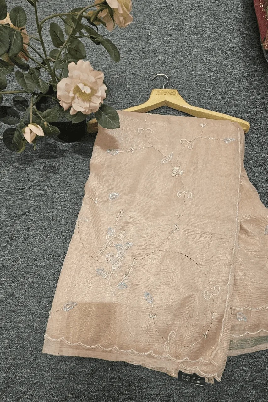 This elegant shimmer tissue saree is beautifully handcrafted with delicate sequence, pearl, and cutdana work along the booties, adding a subtle yet graceful charm. The understated floral motifs elevate its timeless appeal—perfect for sophisticated occasions.