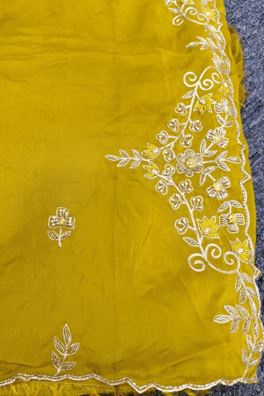 Elegant silk organza saree handcrafted with pearl, cutdana, and zardoshi work — a perfect blend of grace and intricate craftsmanship.