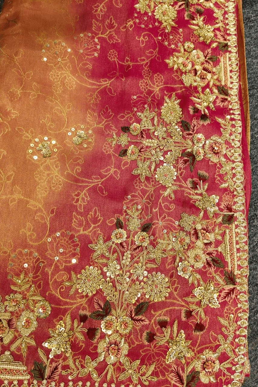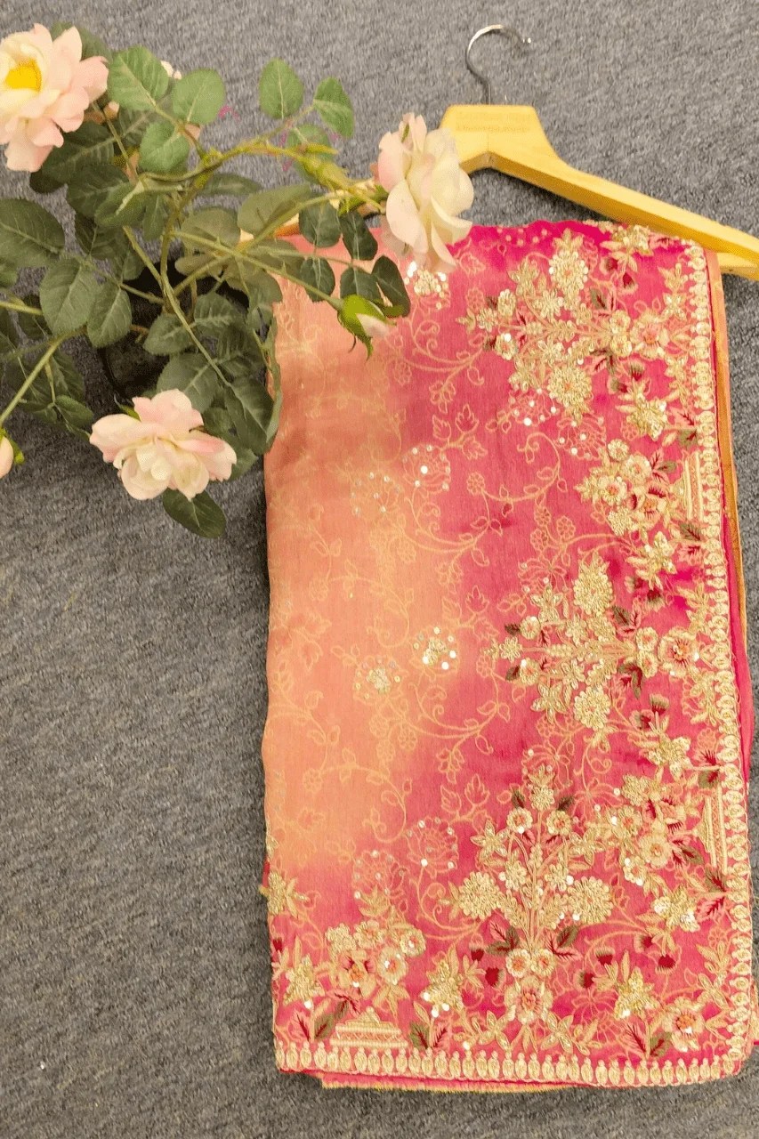 This exquisite Banarasi weaved Upada saree features a stunning two-tone blend of peach and pink. It is beautifully handcrafted with a mix of sequence, cutdana, zardoshi, and pearl work, accentuated with intricate thread embroidery for a rich, regal finish.