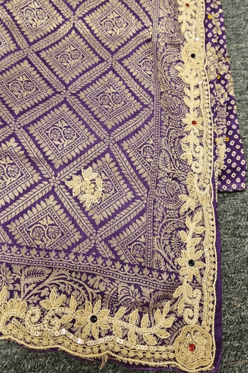 A stunning blend of tradition and luxury, this Banarasi Upada saree features intricate Zardoshi work, a richly detailed heavy border, and delicate Bandhej design within. A perfect statement piece for grand occasions.