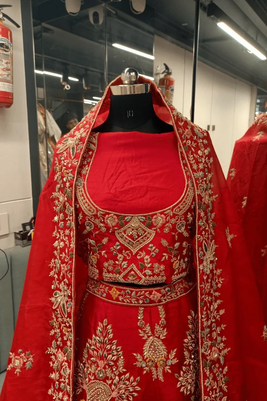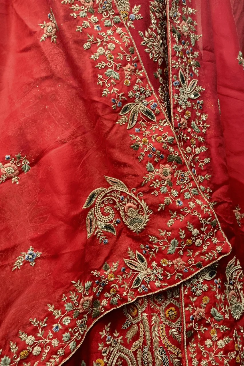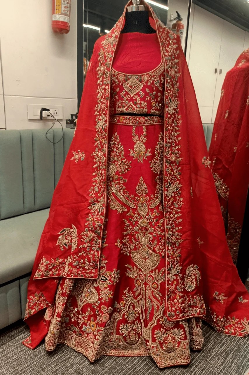 Make a grand statement on your special day with this stunning Red Bridal Lehenga with multicolored treadwork, a masterpiece of traditional craftsmanship and regal elegance. Meticulously designed for weddings and unforgettable occasions, this lehenga features heavy Zardosi embellishments, showcasing intricate handwork that exudes timeless luxury and opulence.