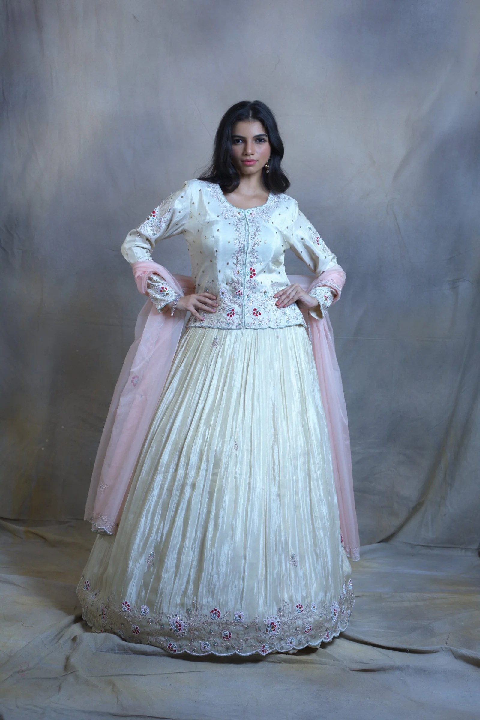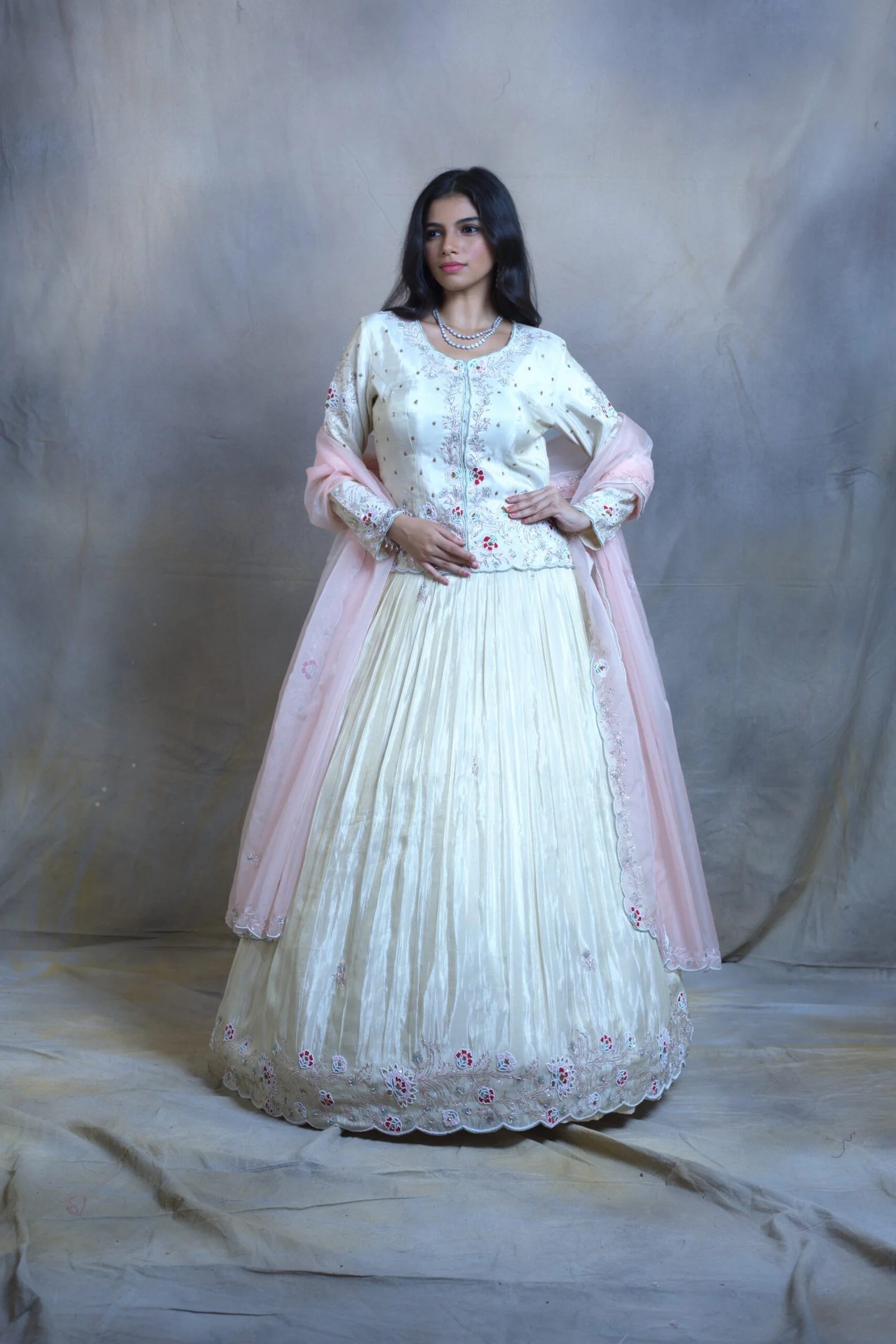 Step into understated opulence with our golden tissue lehenga set, paired elegantly with a tailored kurti. This ensemble captures the glow of heritage textiles, elevated with delicate hand embroidery, accented by lustrous pearls and subtle sequins that shimmer with every glance. The lightweight tissue fabric drapes gracefully, offering a fluid silhouette that blends tradition with modern finesse.