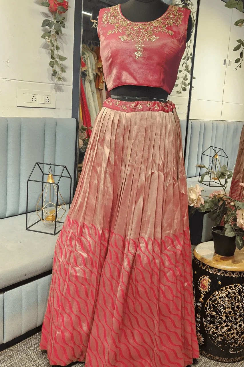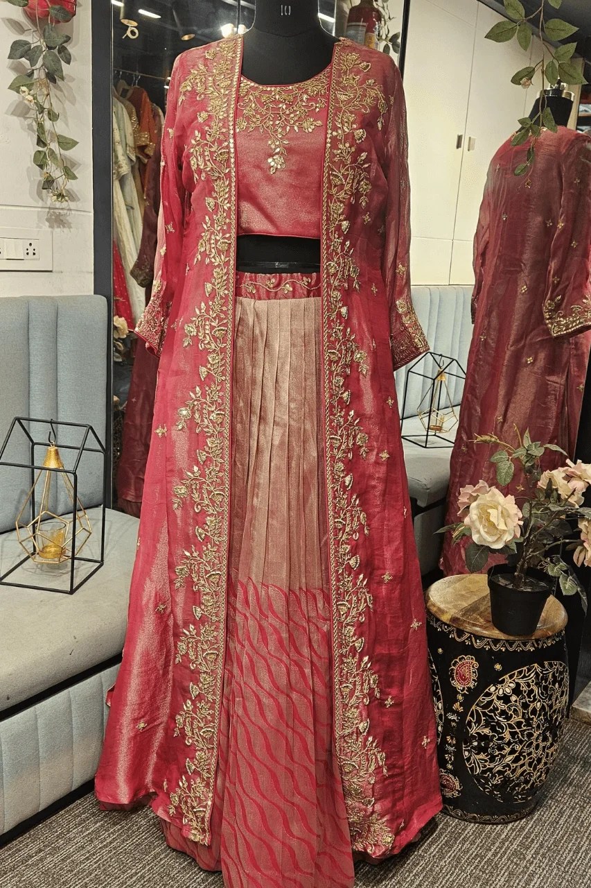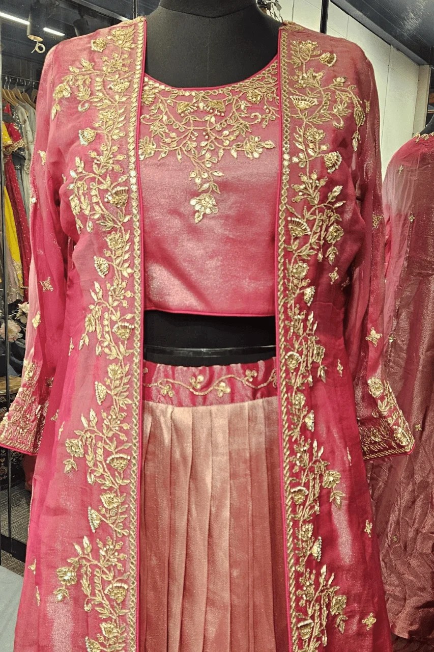 Step into timeless glamour with this deep rose pink lehenga set, crafted in shimmering tissue fabric. Paired with a beautifully detailed long jacketand Banarasi ghaghra, the outfit is intricately handcrafted with gotta, pearl, and zardoshi work. A statement ensemble that blends regal charm with festive finesse — ideal for weddings, receptions, or grand celebrations.