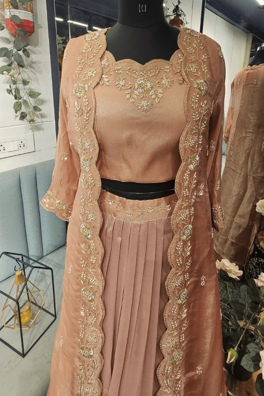 Step into timeless glamour with this rose pink colored lehenga set, crafted in Banarasi Tissue fabric. Paired with a beautifully detailed long jacket, the outfit is intricately handcrafted with zari, pearl, and zardoshi work. A statement ensemble that blends regal charm with festive finesse — ideal for weddings, receptions, or grand celebrations.