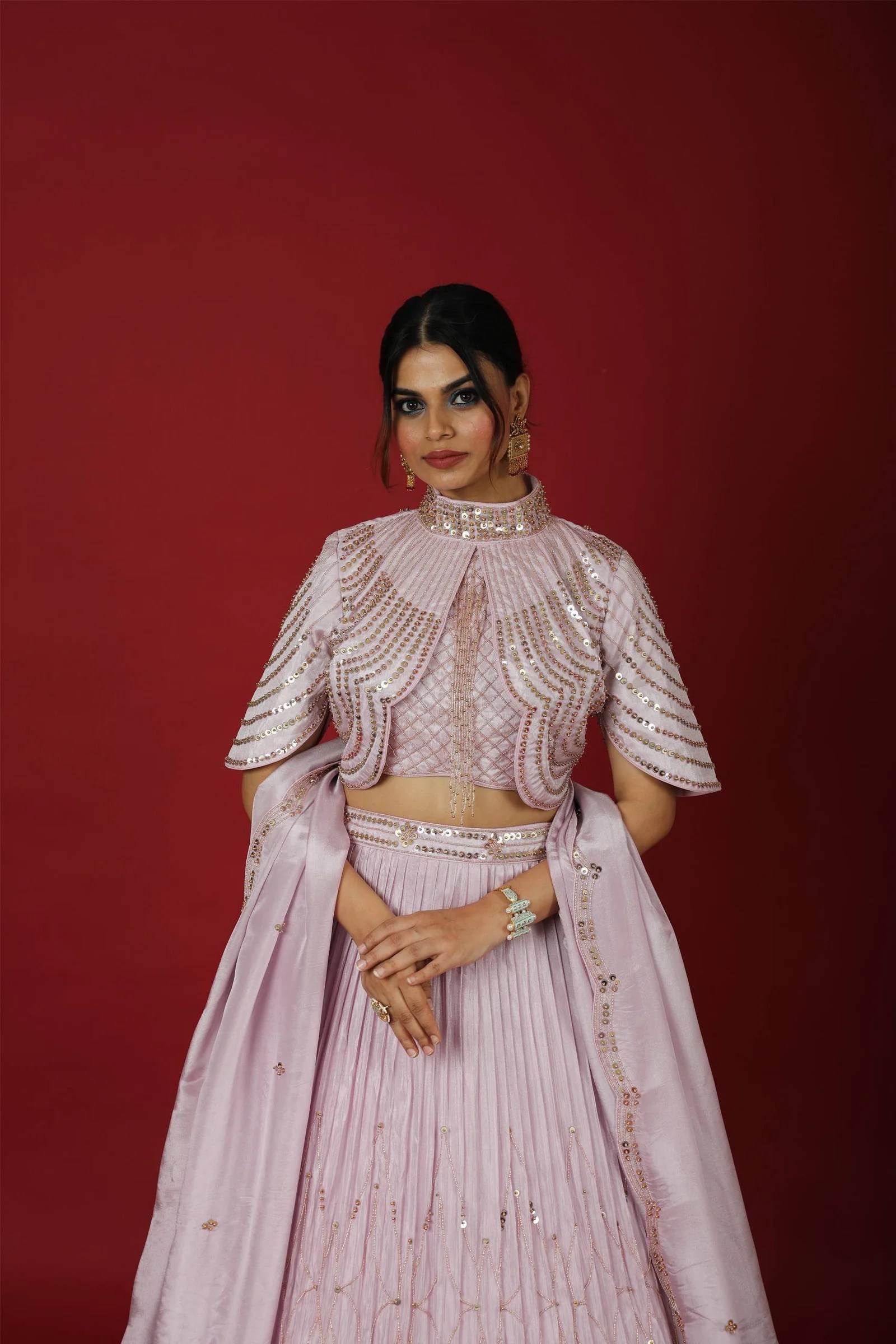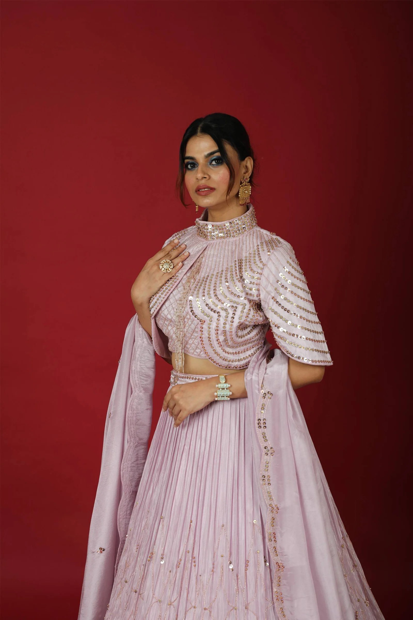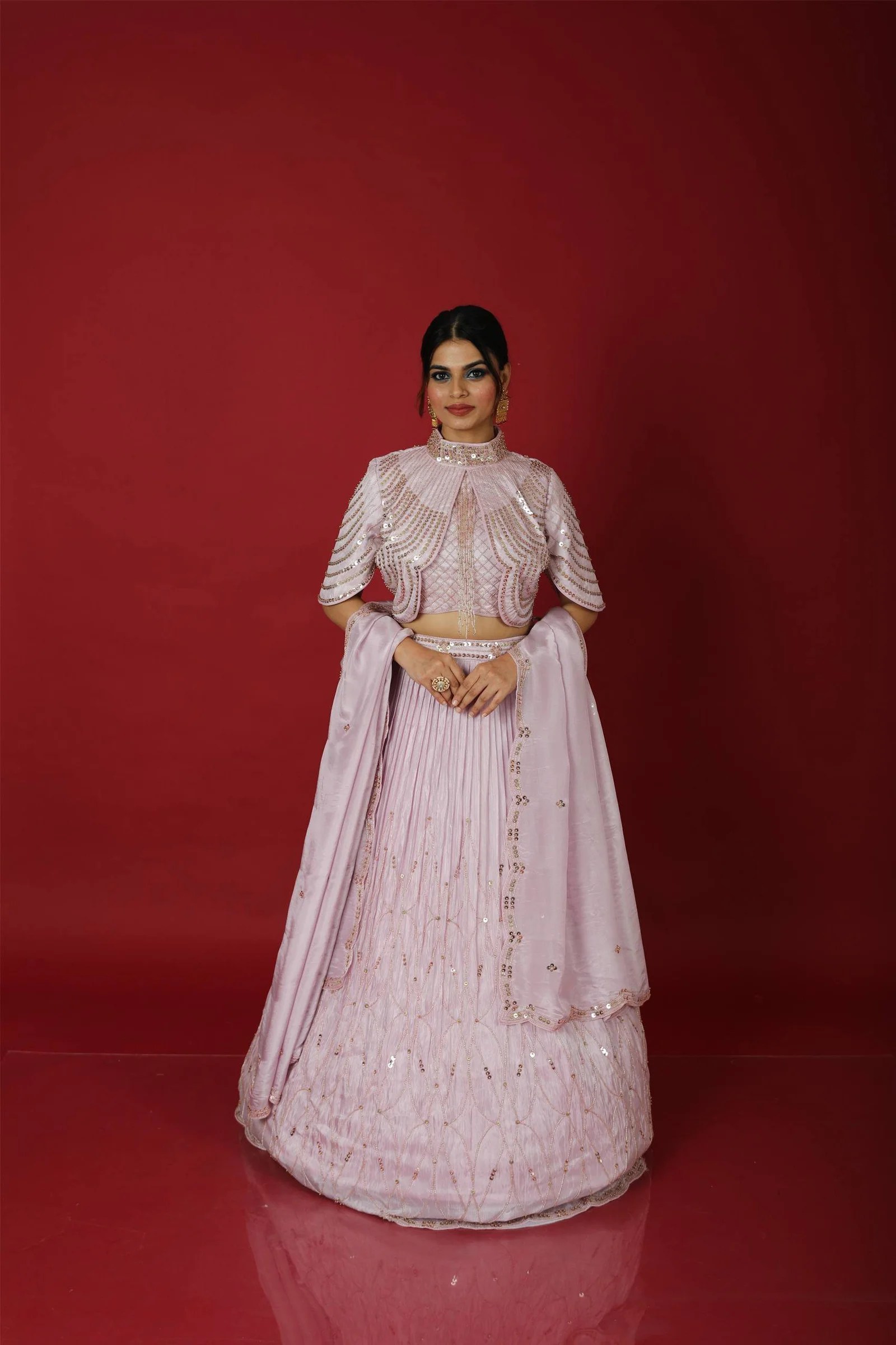 Graceful and ethereal, this pink lehenga in luxurious pearl tissue fabric exudes soft elegance. Handcrafted with metallic sequins work, it offers just the right hint of shimmer, perfect for modern celebrations with a traditional touch.